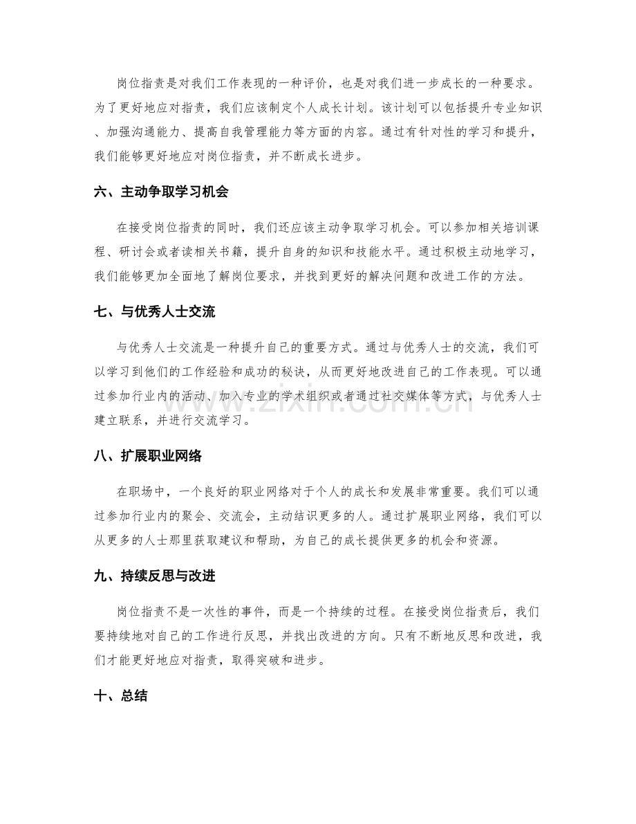 在接受岗位指责的同时,我们还应该主动争取学习机会。可以参加相关培训课程、研讨会或者读相关书籍,提升自身的知识和技能水平。通过积极主动地学习,我们能够更加全面地了解岗位要求,并找到更好的解决问题和改进工作的方法。