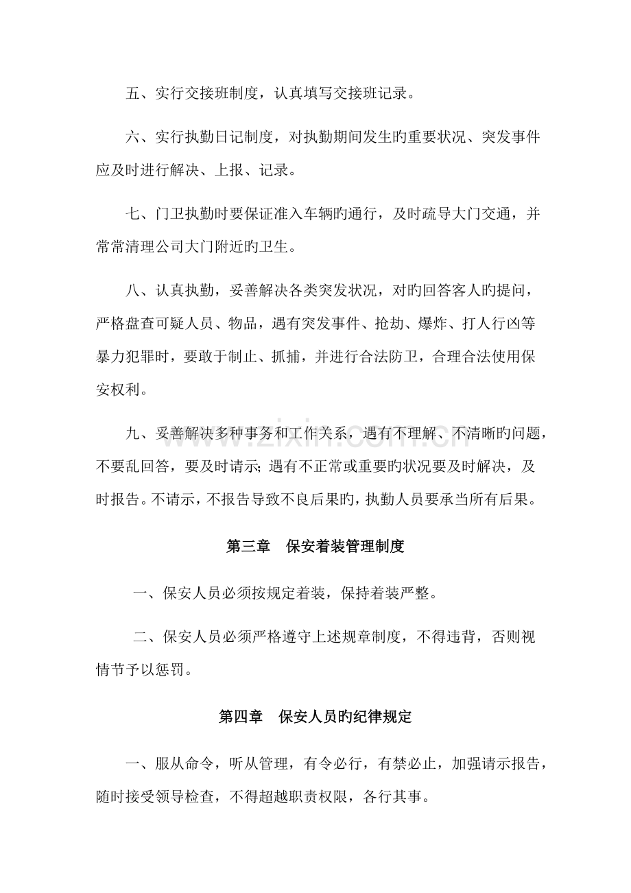 三、坚守岗位,忠于职守,准时上岗,不迟到不早退,不擅自离岗,值勤时不睡觉、不喝酒、不干私活、不闲谈。认真做好公司旳安全防备工作。