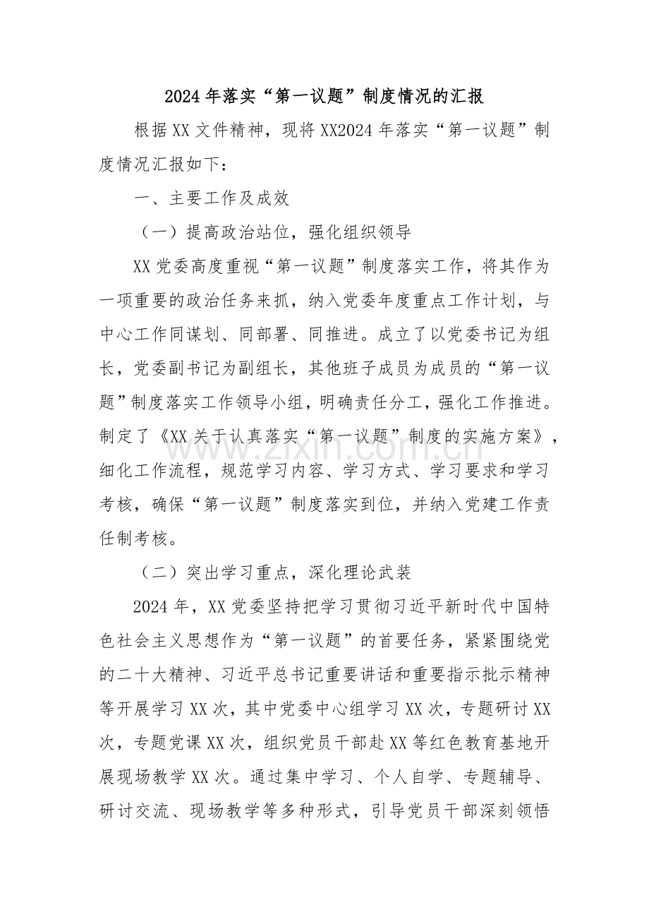 根据XX文件精神,现将XX2024年落实“第一议题”制度情况汇报如下: