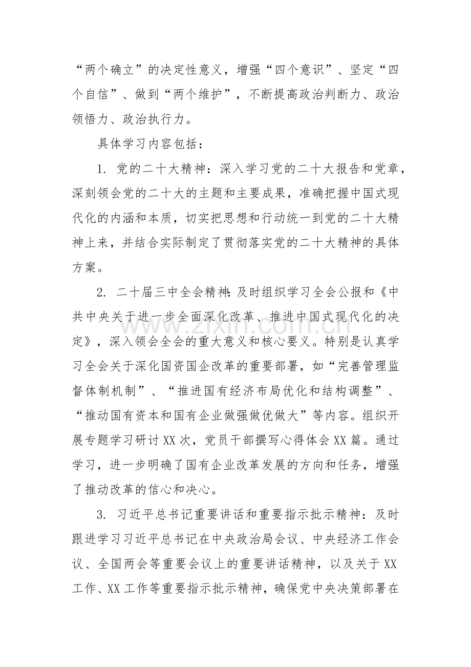 2. 二十届三中全会精神:及时组织学习全会公报和《中共中央关于进一步全面深化改革、推进中国式现代化的决定》,深入领会全会的重大意义和核心要义。特别是认真学习全会关于深化国资国企改革的重要部署,如“完善管理监督体制机制”、“推进国有经济布局优化和结构调整”、“推动国有资本和国有企业做强做优做大”等内容。组织开展专题学习研讨XX次,党员干部撰写心得体会XX篇。通过学习,进一步明确了国有企业改革发展的方向和任务,增强了推动改革的信心和决心。