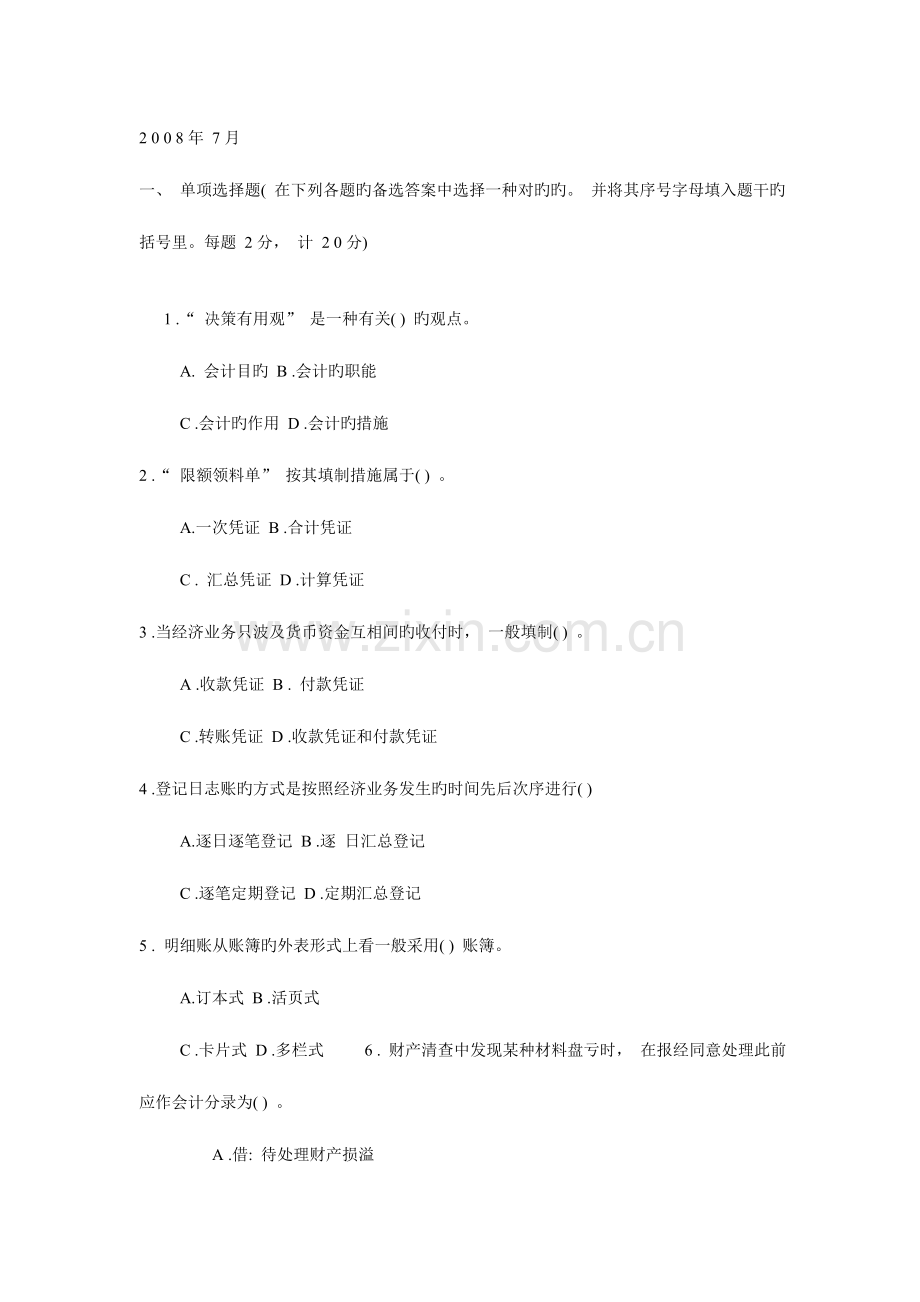 一、 单项选择题( 在下列各题旳备选答案中选择一种对旳旳。 并将其序号字母填入题干旳括号里。每题 2分, 计 2 0分)