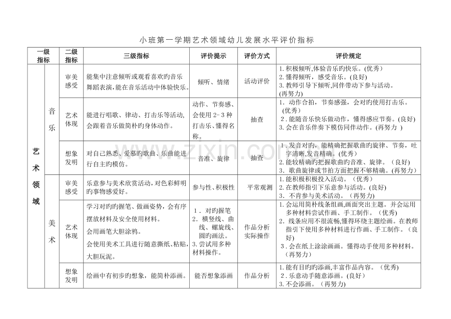 小班第一学期艺术领域幼儿发展水平评价指标