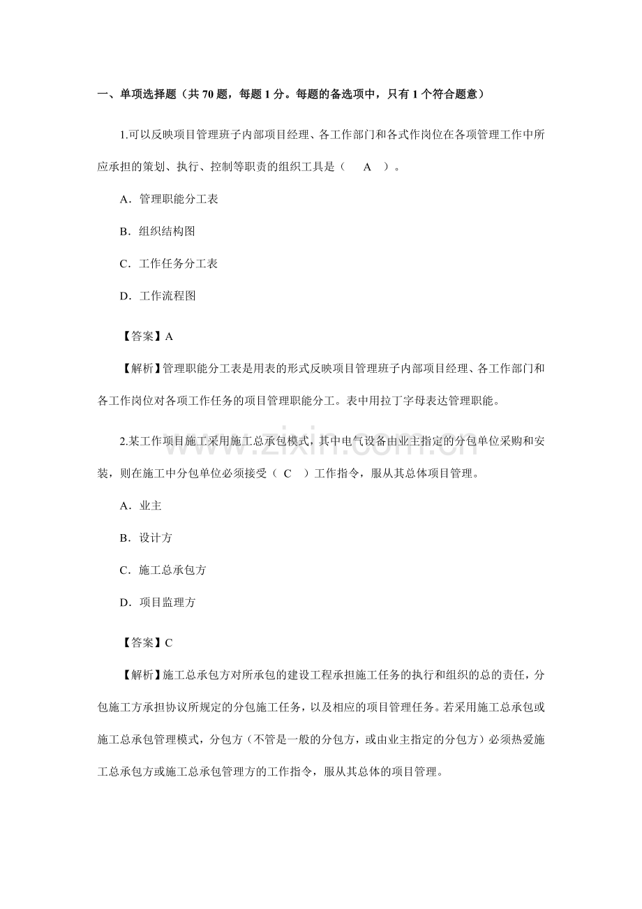 2.某工作项目施工采用施工总承包模式,其中电气设备由业主指定的分包单位采购和安装,则在施工中分包单位必须接受( C )工作指令,服从其总体项目管理。
