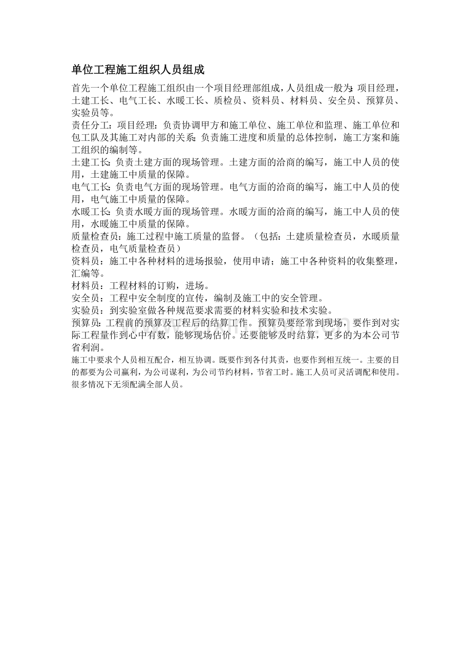 首先一个单位工程施工组织由一个项目经理部组成,人员组成一般为:项目经理,土建工长、电气工长、水暖工长、质检员、资料员、材料员、安全员、预算员、实验员等。