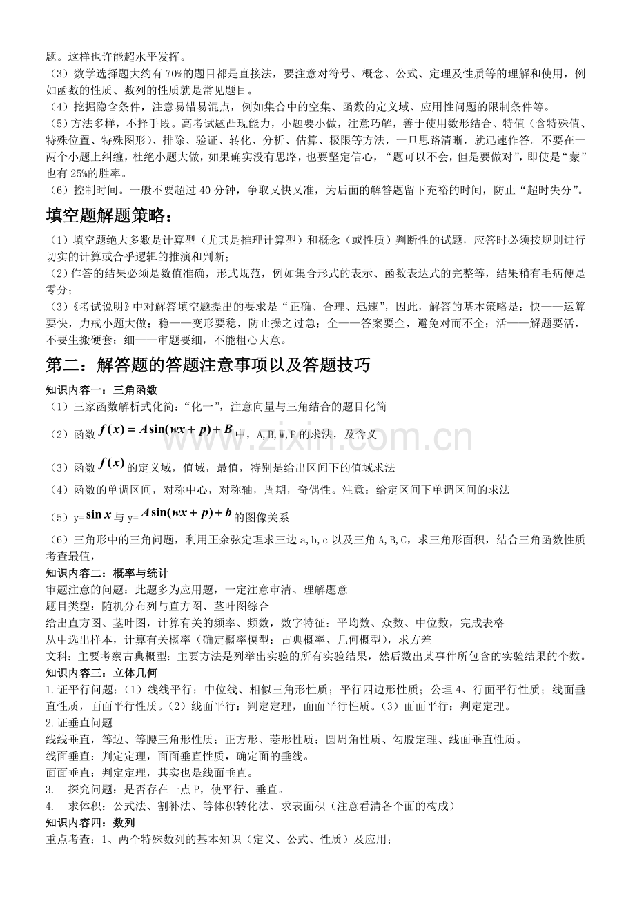 二.内容:高考就是一次独立的作业,只要冷静沉着,注意力集中,把应有的水平发挥出来,该得的分能够完全得到,就已经成功。在考场上,我们应该是兴奋的,等待发挥聪明才智的优秀选手;在心理上应压倒对手。在数学考试中应该有足够的霸气,并且要讲究策略和方法:首先要明确考题的难易结构,特点,高考试题是进门容易,出门难,多个关口,阻挡你通向成功的彼岸。我们就要具有过五关斩六将的勇气与霸气,整个试题的特点是:选择题容易,解答题难。前面的8个题一般简单,精心认真应保证百分百拿分;9,10题难一点,平稳心态做好它;前面四个解答题一般简单,保证拿住分数;20,21题一般第(1)问简单,在第(2)或第(3)问难一些,应尽量多得分。同学们,只要你能在规定的时间内,把尽量多的分数抢到手,胜利就属于你啦。下面就各部分的考试内容和同学们一起回顾强化,在夺关斩将中祝你一臂之力。下面我们一起来理顺一下考查内容及答题过程中的注意事项和技巧