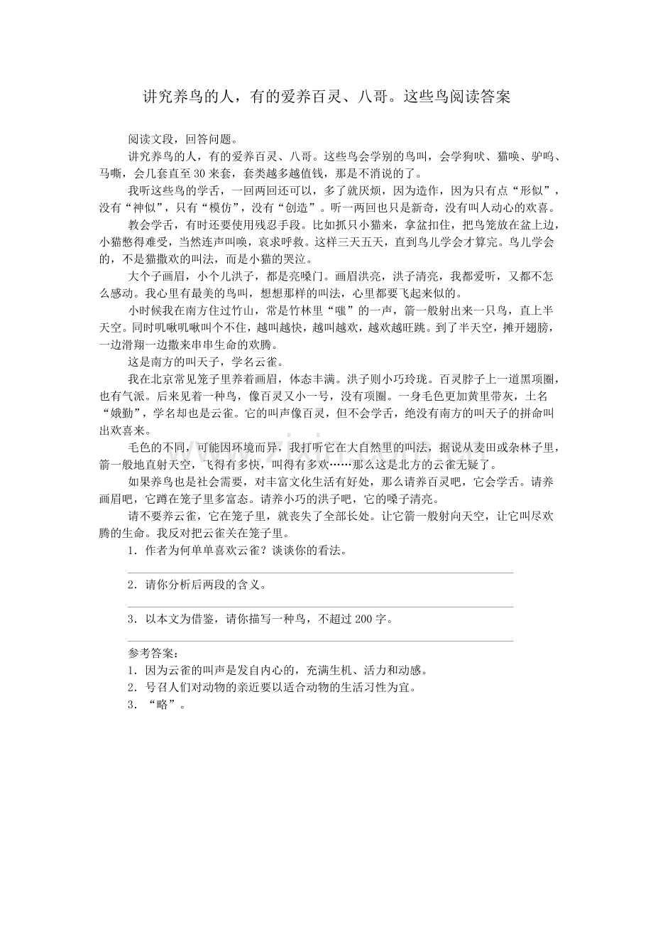 讲究养鸟的人,有的爱养百灵、八哥。这些鸟阅读答案