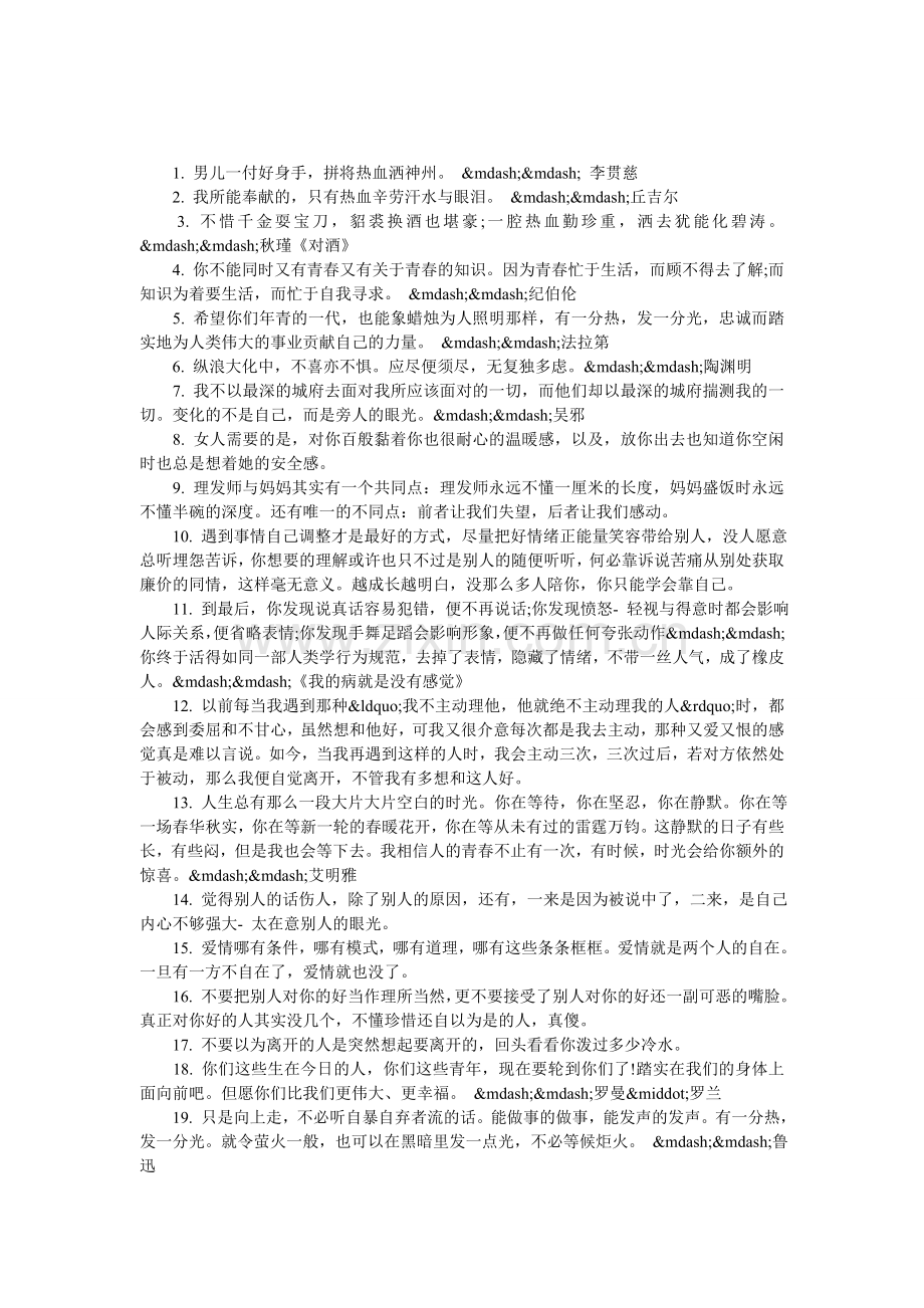 18. 你们这些生在今日的人,你们这些青年,现在要轮到你们了!踏实在我们的身体上面向前吧。但愿你们比我们更伟大、更幸福。 ——罗曼·罗兰