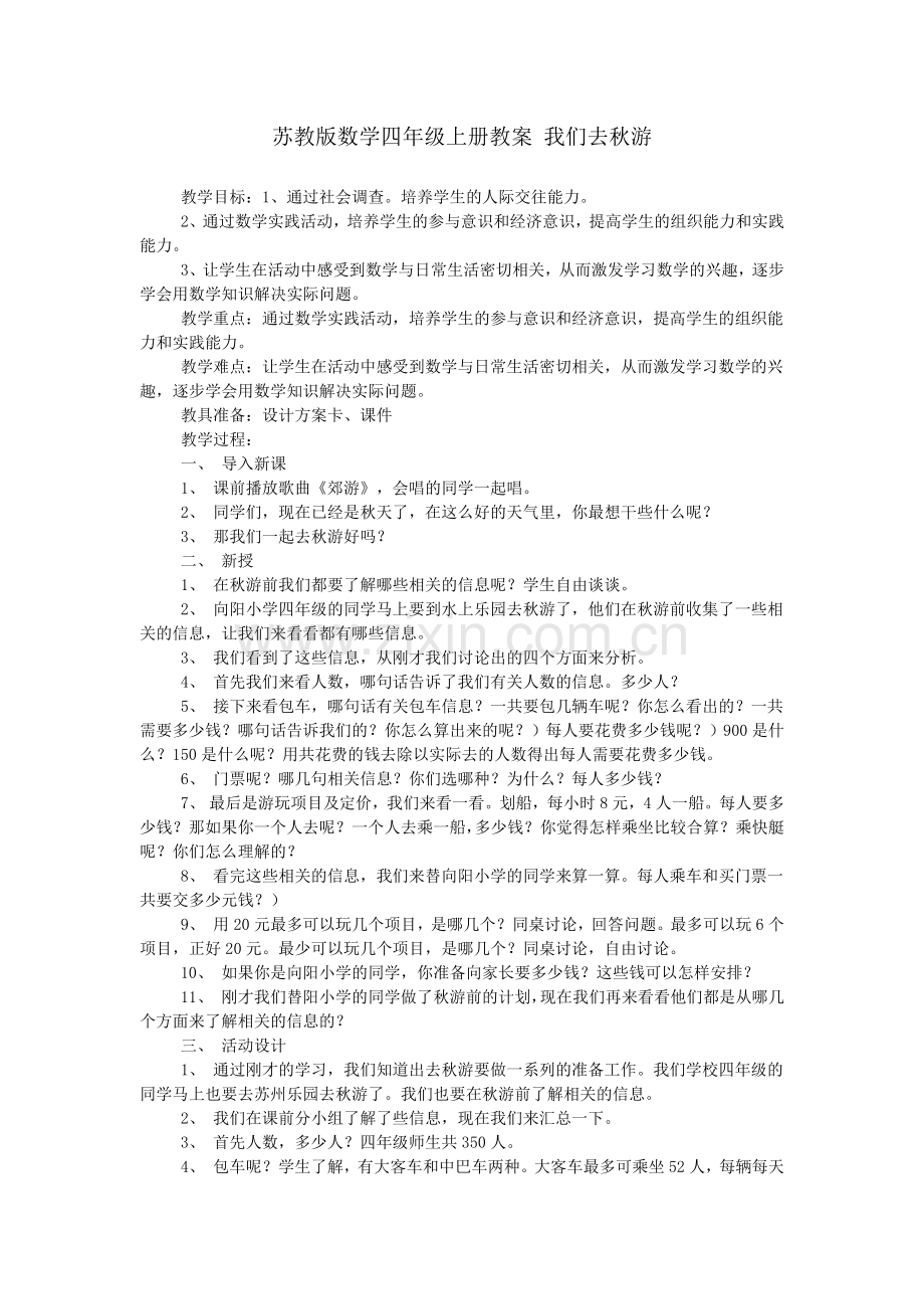 苏教版数学四年级上册教案 我们去秋游