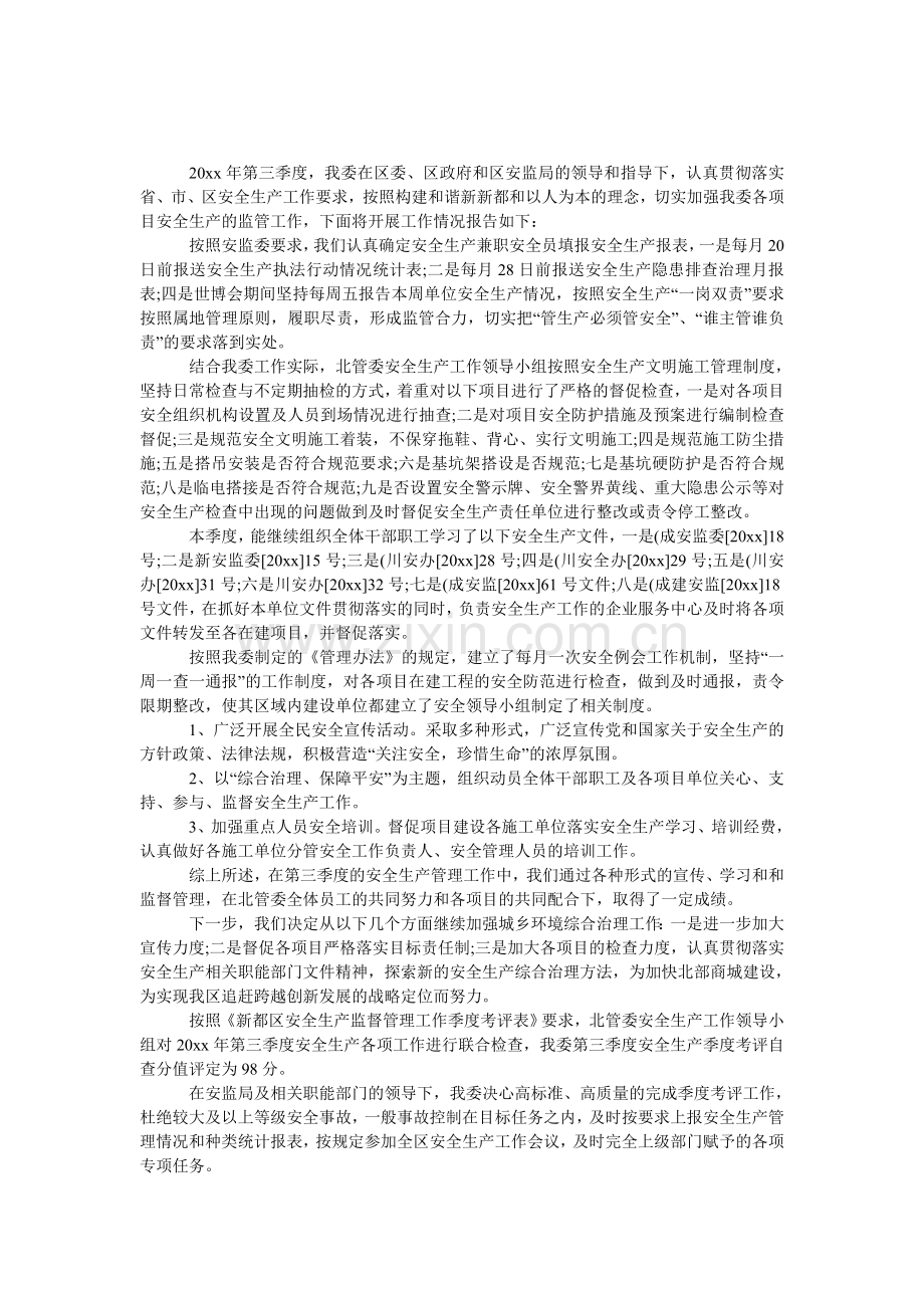 20xx年第三季度,我委在区委、区政府和区安监局的领导和指导下,认真贯彻落实省、市、区安全生产工作要求,按照构建和谐新新都和以人为本的理念,切实加强我委各项目安全生产的监管工作,下面将开展工作情况报告如下:
