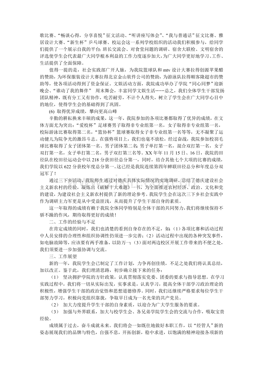 成绩属于过去,奋斗成就未来。我们将会一如既往地做好本职工作,以“经管人”新的姿态展现我们的品牌与特色,自强不息,开拓创新,稳中求进,以饱满的精神迎接各项新的挑战,用心做好每件工作,精益求精,为实现创建一流学生会的目标奋进。 学生会一年工作总结