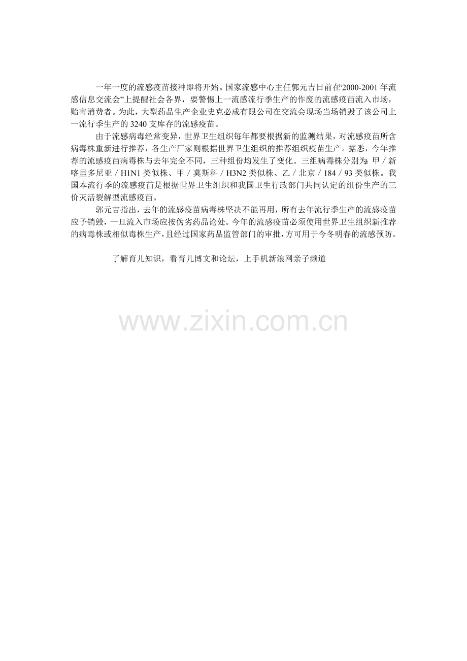一年一度的流感疫苗接种即将开始。国家流感中心主任郭元吉日前在“2000-2001年流感信息交流会”上提醒社会各界,要警惕上一流感流行季生产的作废的流感疫苗流入市场,贻害消费者。为此,大型药品生产企业史克必成有限公司在交流会现场当场销毁了该公司上一流行季生产的3240支库存的流感疫苗。