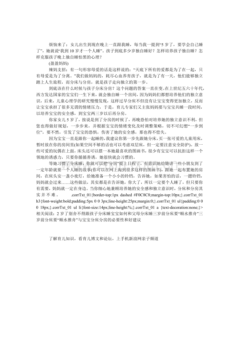 等她习惯了分床睡,你就可以把“分房”提上日程了,有意识地给她讲一些小朋友到了一定年龄就要一个人睡的故事(你可以在网上淘到很多这样的图画书),跟她一起布置她的房间,在床头安一盏小夜灯,给她准备一个小小的铃铛,告诉她,如果害怕的话,一摁铃铛,妈妈就会过来……这些做法,其实都是在告诉她,你大了,所以一定要个人睡了,但只要你有需要,妈妈就一定在身边。当你细心地兼顾培养她的安全感和独立意识时,分床和分房其实并不难。 .corrTxt_01{border-top:1px dashed #F0C8C8;margin-top:10px;}.corrTxt_01 h3{font-weight:bold;padding:5px 0 0 3px;line-height:25px;margin:0;}.corrTxt_01 ul{padding:0 0 0 18px;}.corrTxt_01 ul li{font-size:14px;line-height:%;}.corrTxt_01 a {text-decoration:none;}> 相关阅读:2岁了别舍不得跟孩子分床睡宝宝如何和父母分床睡三岁前分床要“顺水推舟”三岁前分床要“顺水推舟”与宝宝分床分房的必要性和好建议