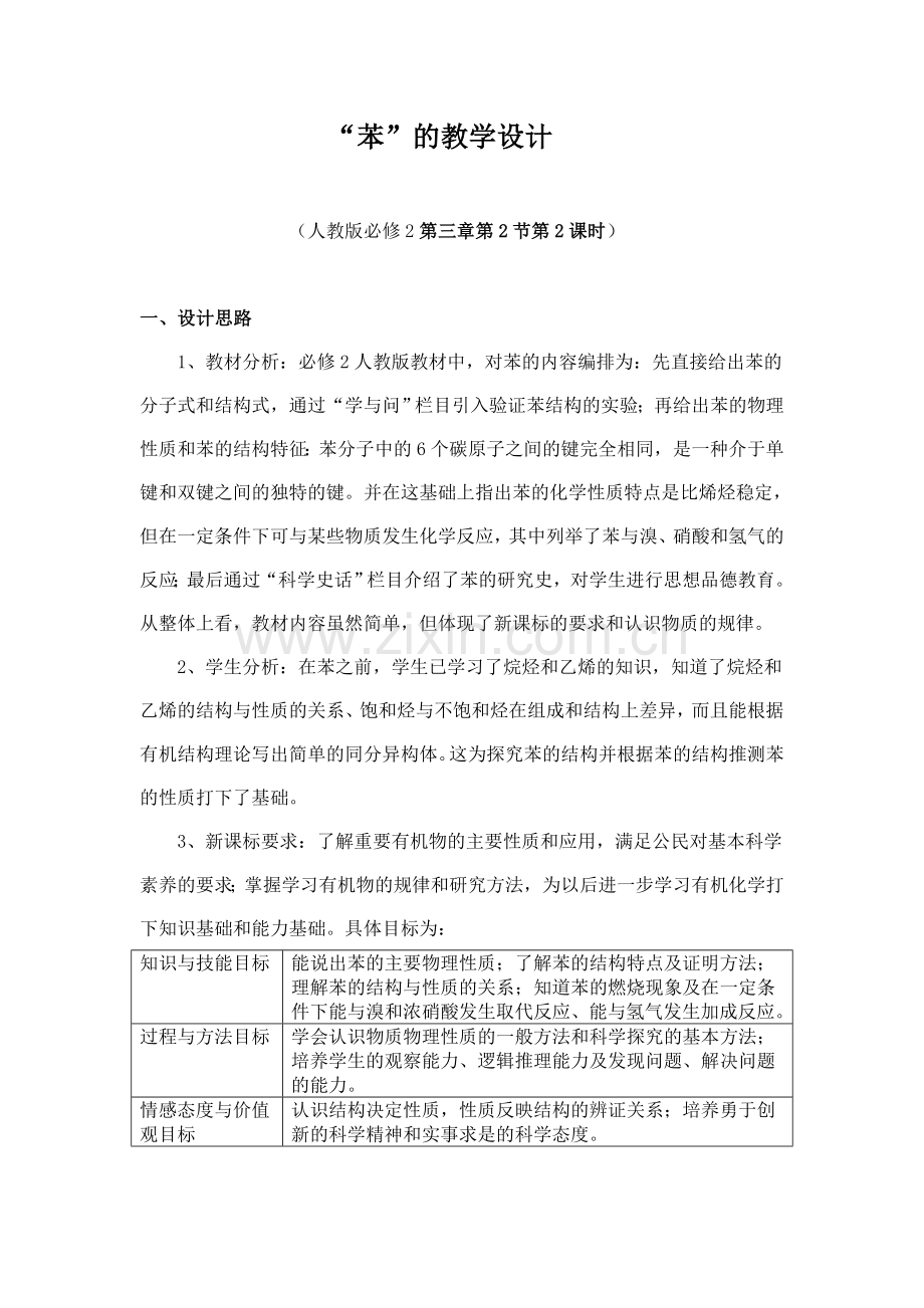 1、教材分析:必修2人教版教材中,对苯的内容编排为:先直接给出苯的分子式和结构式,通过“学与问”栏目引入验证苯结构的实验;再给出苯的物理性质和苯的结构特征:苯分子中的6个碳原子之间的键完全相同,是一种介于单键和双键之间的独特的键。并在这基础上指出苯的化学性质特点是比烯烃稳定,但在一定条件下可与某些物质发生化学反应,其中列举了苯与溴、硝酸和氢气的反应;最后通过“科学史话”栏目介绍了苯的研究史,对学生进行思想品德教育。从整体上看,教材内容虽然简单,但体现了新课标的要求和认识物质的规律。