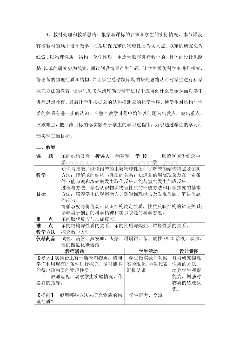 4、教材处理和教学思路:根据新课标的要求和学生的实际情况,本节课没有按教材的顺序设计教学,而是以探究苯的物理性质为切入点、以苯的研究史为线索、以物理性质—结构—化学性质—用途为顺序进行教学的。具体的设计思路是:以苯的研究史为线索,通过创设情景产生问题,让学生模仿科学家进行探究,得出苯的物理性质和结构,并让学生总结凯库勒的探究思路从而对学生进行科学探究方法的教育,让学生思考从凯库勒的研究过程中应得到什么启示从而对学生进行思想教育。最后让学生根据苯的结构推测苯的化学性质,使学生对结构与性质的关系有进一步的认识。在整个教学过程中始终以问题为出发点,突出重点、突破难点,把三维目标的落实融合于学生的学习过程中,力求通过学生的学习活动实现三维目标。