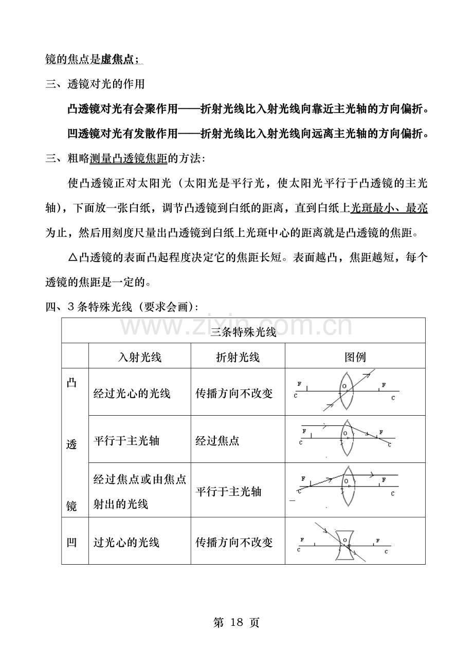 △注意:1)成实像:照相机、投影仪、幻灯机、小孔成像;成虚像:平面镜成像、放大镜、凹透镜;2)凹透镜始终成缩小、正立的虚像。
