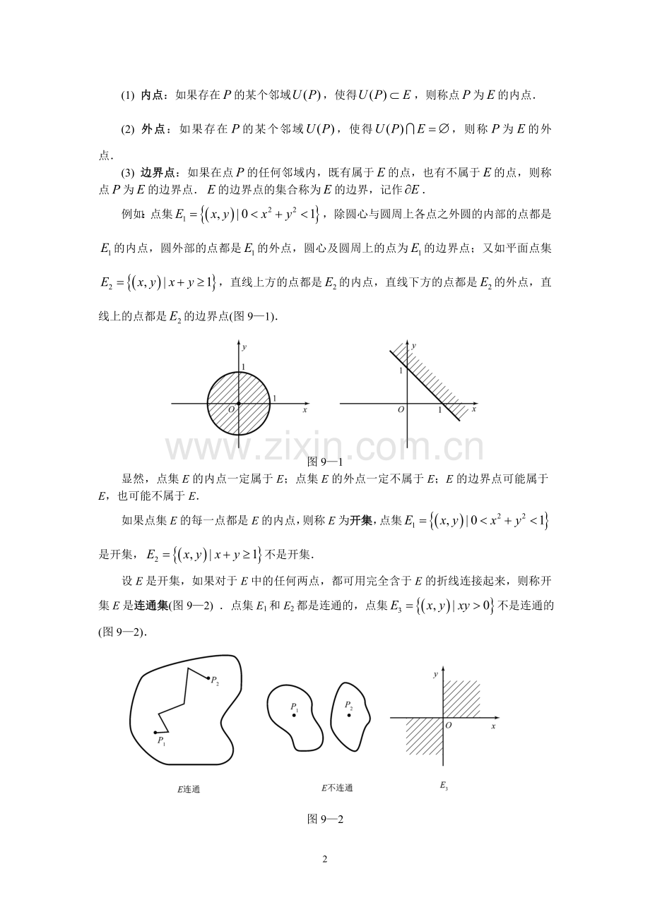 例如:点集,除圆心与圆周上各点之外圆的内部的点都是的内点,圆外部的点都是的外点,圆心及圆周上的点为的边界点;又如平面点集,直线上方的点都是的内点,直线下方的点都是的外点,直线上的点都是的边界点(图9—1).