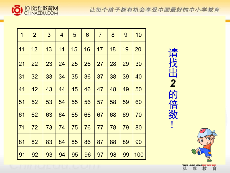 单击此处编辑母版标题样式,单击此处编辑母版文本样式,第二级,第三级,第四级,第五级,*,*,单击此处编辑母版标题样式,单击此处编辑母版文本样式,第二级,第三级,第四级,第五级,单击此处编辑母版标题样式,单击此处编辑母版文本样式,第二级,第三级,第四级,第五级,*,2、5的倍数特征,1 2 3 4 5 6 7 8 9 10,11 12 13 14 15 16 17 18 19 20,21 22 23 24 25 26 27 28 29 30,31 32 33 34 35 36 37 38 39 40,41 42 43 44 45 46 47 48 49 50,51 52 53 54 55 56 57 58 59 60,61 62 63 64 65 66 67 68 69 70,71 72 73 74 75 76 77 78 79 80,81 82 83 84 85 86 87 88 89 90,91 92 93 94 95 96 97 98 99 100,请找出 的倍数!,2,1 2 3 4 5 6 7 8 9 10,11 12 13 14 15 16 17 18 19 20,21 22 23 24 25 26 27 28 29 30,31 32 33 34 35 36 37 38 39 40,41 42 43 44 45 46 47 48 49 50,51 52 53 54 55 56 57 58 59 60,61 62 63 64 65 66 67 68 69 70,71 72 73 74 75 76 77 78 79 80,81 82 83 84 85 86 87 88 89 90,91 92 93 94 95 96 97 98 99 100,请找出 的倍数!,2,说一说:2的倍数有什么特征?,2的倍数的特征:个位上是0、2、4、6、8的数,是2的倍数。,偶数,:是的倍数的数。,个位,上是,,,的数。,奇数,:不是的倍数的数。,个位,上是,,,的数。,整数中,是2的倍数叫做偶数(0)也是偶数,,不是2的倍数叫奇数。,练一练,下面哪些数是的倍数?,48 51 65,()()()(),104 153 280,()()()(),是,是,是,是,是,29,186,78,256,8321,93,174,55,找出2的倍数。,奇数,偶数,52,77,124,501,3170,4286,6003,600,3,下面哪些数是奇数,哪些是偶数?把它们分别填入下面适当的圈里。,5,2,12,4,317,0,428,6,7,7,50,1,个位上是,,,,,的数,。,个位上是,,,的数。,1 2 3 4 5 6 7 8 9 10,11 12 13 14 15 16 17 18 19 20,21 22 23 24 25 26 27 28 29 30,31 32 33 34 35 36 37 38 39 40,41 42 43 44 45 46 47 48 49 50,51 52 53 54 55 56 57 58 59 60,61 62 63 64 65 66 67 68 69 70,71 72 73 74 75 76 77 78 79 80,81 82 83 84 85 86 87 88 89 90,91 92 93 94 95 96 97 98 99 100,请找出 的倍数!,5,1 2 3 4 5 6 7 8 9 10,11 12 13 14 15 16 17 18 19 20,21 22 23 24 25 26 27 28 29 30,31 32 33 34 35 36 37 38 39 40,41 42 43 44 45 46 47 48 49 50,51 52 53 54 55 56 57 58 59 60,61 62 63 64 65 66 67 68 69 70,71 72 73 74 75 76 77 78 79 80,81 82 83 84 85 86 87 88 89 90,91 92 93 94 95 96 97 98 99 100,请找出 的倍数!,5,说一说:5的倍数有什么特征?,个位上是0或5的数,是5的倍数。,下面哪些数是的倍数?,12 25 48 60 72 90,(,),(,是,),(,),(,是,),(,是,),(,),5的倍数的特征:个位,上是,或,的数是的倍数。,想一想,下面那些数是2的倍数,哪些数是5的倍数?,60 75 106 130 521,()()()()(),2,2,2,5,5,5,想一想:,既是,的倍数又是,的倍数的数有什么特点?,个位,上是,的数它既是的倍数又是的倍数,选出,两,张数字卡片,按要求组成一个数。,0,5,6,7,(1)组成的数是,偶数;,50,60,70,56,76,(2)组成的数是,5,的,倍数,;,50,60,70,65,75,(3)组成的数既是,2,的倍数又是,5,的倍数;,50,60,70,用0、2、5三个数字组成一个三位数。,1.组成的数是2的倍数;,2.组成的数是5的倍数。,你分别组成了哪几个数?,1 2 3 4 5 6 7 8 9 10,11 12 13 14 15 16 17 18 19 20,21 22 23 24 25 26 27 28 29 30,31 32 33 34 35 36 37 38 39 40,把下表中4的倍数涂上颜色。,4的倍数是2的倍数吗?,因为4是2的倍数,所以4的倍数都是2的倍数。,下面的判断对吗?说说你的理由。,(1)个位上是2、4、6的数,都是2的倍数。,(2)个位上是1、3、5、7、9的数都是奇数。,(3)在全部自然数里,不是奇数就是偶数。,找一找。,26,45,65,102,144,96,2的倍数,5的倍数,填一填:,1.个位上的数是_的自然数一定,是,2,的倍数,也叫_。,0、2、4、6、8,偶 数,2,.,个位上的数是_的自然数一定是,5,的倍数。,0 或 5,3.一个数,如果既是,2,的倍数,又是,5,的倍数,这个数,的个位上一定是_。,0,用哪一种盒子能正好装完?,本课小结,本节课我们主要学习了2、5的倍数特征,同学们要掌握2、5的倍数特征,能够判断一个数能够同时被哪些数整除。,