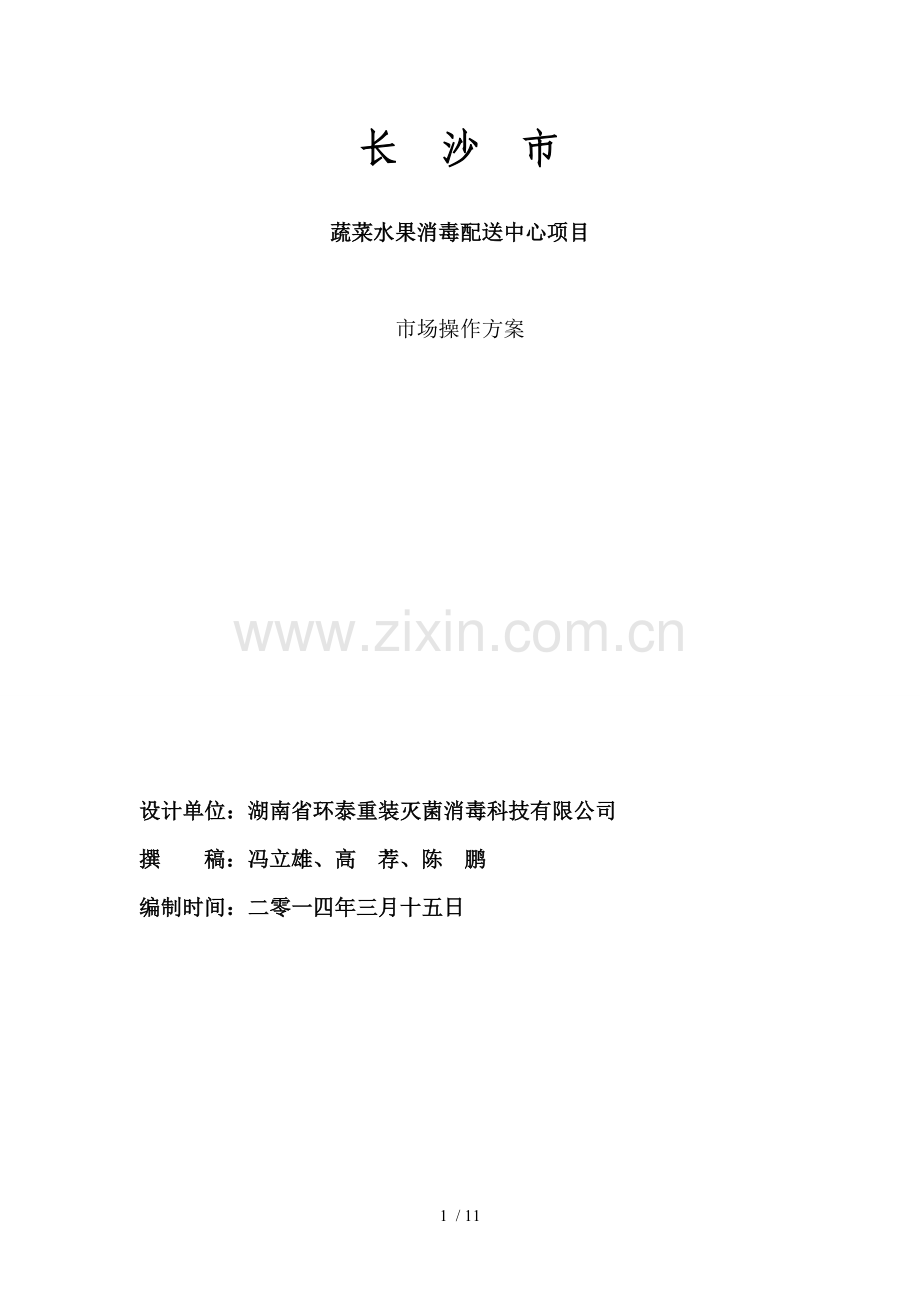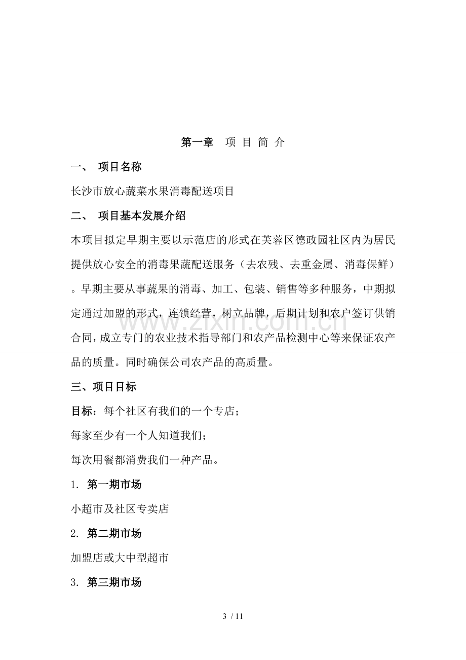 本项目拟定早期主要以示范店的形式在芙蓉区德政园社区内为居民提供放心安全的消毒果蔬配送服务(去农残、去重金属、消毒保鲜)。早期主要从事蔬果的消毒、加工、包装、销售等多种服务,中期拟定通过加盟的形式,连锁经营,树立品牌,后期计划和农户签订供销合同,成立专门的农业技术指导部门和农产品检测中心等来保证农产品的质量。同时确保公司农产品的高质量。