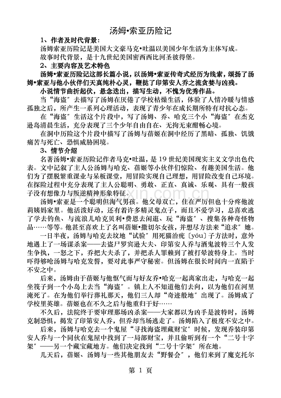 1.汤姆•索亚历险记这部小说是为儿童写,你也一定读过,你能概括这本书主要内容吗?〔不少于50字〕