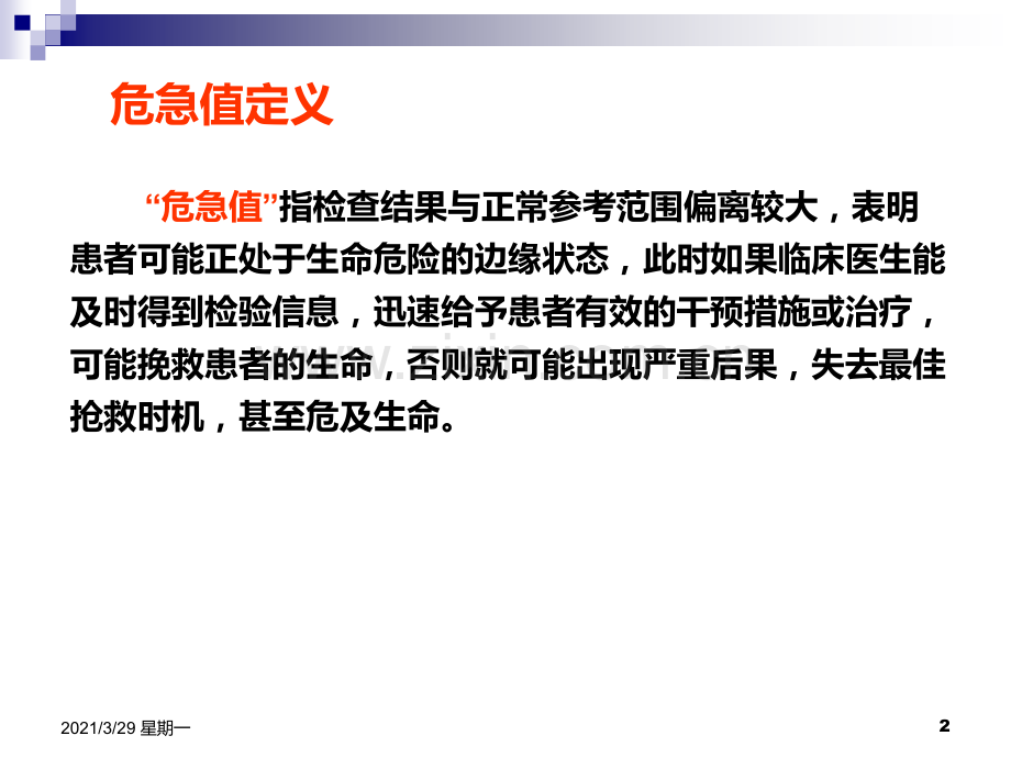 临床危急临床危急心电图心电图的识别的识别2017年年11月月教授、主任医师 2021/3/29 星期一1危急值定义 “危急值”指检查结果与正常参考范围偏离较大,表明患者可能正处于生命危险的边缘状态,此时如果临床医生能及时得到检验信息,迅速给予患者有效的干预措施或治疗,可能挽救患者的生命,否则就可能出现严重后果,失去最佳抢救时机,甚至危及生命。2021/3/29 星期一2常见心电图危急值项目1:心室扑动、颤动;2:室性心动过速;3:多源性、RonT型室性早搏;4:频发室性早搏并Q-T间期延长;5:预激综合征伴快速心室率心房颤动;6:心室率大于180次/分的心动过速;7:二度II型及二度II型以上的房室传导阻滞;8:心室率小于40次/分的心动过缓;9:大于3秒的停搏10:低钾或髙钾心电图表现11:心肌缺血、心肌损伤、心肌梗死2021/3/29 星期一32021/3/29 星期一4正常心电图2021/3/29 星期一52021/3/29 星期一6简化的心脏解剖及传导系统简化的心脏解剖及传导系统窦房结房室结右束支左束支左后分支左前分支2021/3/29 星期一7X 2XX 2X室性早搏2021/3/29 星期一8偶发单源性室性早搏 频发单源性室性早搏(呈二联律)2021/3/29 星期一9频发多源室性早搏2021/3/29 星期一10多源性频发室性早搏 连发室性早搏 2021/3/29 星期一11短阵室性心动过速(连续三次以上早搏)R-on-T现象2021/3/29 星期一12室性心动过速发作前 发作中 发作后2021/3/29 星期一132021/3/29 星期一152021/3/29 星期一162021/3/29 星期一17室上速分类室上速分类(一)常见型 1、房室顺向型环行折返性的心动过速(发生率40%)2、房室结折返性心动过速(发生率50%)(二)非常见型(发生率10%)1、房室结折返性心动过速(不典型性)2、不间断型交界区反复性心动过速(由一条慢径路参与的环行运动)3、房室结自律性增高心动过速 4、窦房结折返性心动过速 5、房内折返性及自律性增高房性心动过速。2021/3/29 星期一18心房扑动心房颤动2021/3/29 星期一19心房颤动心房颤动心房颤动(atrial fibrillation,Af)简称房颤,是最常见的心律失常之一,是由心房主导折返环引起许多小折返环导致的房律紊乱。房颤的心电图心律绝对不整齐,P-P间期绝对不齐,在f波不显或由于心室率过快f波观察不清时,可结合P波消失而作出此诊断。看不到正常的心房波,P波消失,代之以大小不等、形态不同的f波,以V1、aVF导联为明显。房颤发作频率包括心房频率和心室频率,一般心房频率超过350次/分,心室频率根据传导情况,可快可慢,慢的有70次/分,快的可以达到200次/分。但是房颤的发作频率跟患者有无服用药物、有无甲亢等有密切关系。2021/3/29 星期一202021/3/29 星期一21心房扑动心房扑动(1)各导联的p波消失,代之以大小、形态相同、节律规则、快速的、连续锯齿样扑动波(又称F波),频率为250-350次/分,F波多在v1、II、III、avF导联中明显可见。F波之间密切衔接,两肢对称。(2)QRS波群呈室上性,有时QRS波群增宽并畸形。(3)F-R间期常相等,或略有不等。但当伴有隐匿性房室传导、房室传导阻滞、房室分离时,F-R间期不等。(4)心房扑动时,心房激动极快,但房室交界区的正常不应期相对较长,因此,不是所有的心房激动都能下传到心室,因而可产生间隔规则的部分传导,或间隔不规则的传导,常呈2 1、3 1、4 1或不同比例的房室传导,使心室率不规则。2021/3/29 星期一222021/3/29 星期一23心室扑动1.无正常的QRST波群,代之以连续快速而相对规则的大振幅波动;2.扑动波频率达200250次/min心室扑动 常为一过性,如未能及时恢复正常,便会迅速转为心室颤动。2021/3/29 星期一24心室颤动 心室颤动常常是心脏停跳前的短暂征象,心脏完全失去排血功能,是最严重的心律失常。1.QRST波群完全消失,出现大小不等、极不匀齐的低小波;2.频率达200500次/min最初的颤动波常较粗大,以后逐渐变小,如抢救无效最终将变为等电位线,示心脏电活动停止。2021/3/29 星期一252021/3/29 星期一26预激综合征V1 V2V62021/3/29 星期一27 预激综合征预激综合征(一)房室旁道心电图 pr间期(实质上是p-间期)缩短至0.12秒以下,大多为0.10秒;qrs时限延长达0.11秒以上;qrs波群起始部粗钝,与其余部分形成顿挫,即所谓预激;继发性st-t波改变。上述心电图改变尚有分为a、b两型的。a型的预激波和qrs波群在v1导联均向上,而b型v1导联的预激波和qrs波群的主波则均向下;前者提示左室或右室后底部心肌预激,而后者提示右室前侧壁心肌预肌。(二)房结、房希旁道 pr间期少于0.12秒,大多在0.10秒;qrs波群正常,无预激波。这种心电图表现又称为短pr综合征。(三)结室、束室连接 pr间期正常,qrs波群增宽,有预激波。2021/3/29 星期一285.0sec3.0sec2021/3/29 星期一29二度二型房室传导阻滞 二度一型房室传导阻滞2021/3/29 星期一302021/3/29 星期一312021/3/29 星期一32三度三度房室传导阻滞房室传导阻滞2021/3/29 星期一33III度阻滞度阻滞2021/3/29 星期一34 4.05.5mmol/L 5.5mmol/L 7.5mmol/L血钾异常心电图表现2021/3/29 星期一36体液的钾浓度与心肌的应激性呈负相关。血钾浓度增高对心肌有抑制作用,心律缓慢,出现心律失常如室性早搏、房室传导阻滞、心室颤动以至心搏骤停于舒张期。血钾浓度过低亦可产生心律失常,早期出现心率增快,房性或室性早搏,以后出现多源性或室心动过速,严重者出现心室扑动、心室颤动,以至心搏骤停于收缩期。2021/3/29 星期一37高钾血症 血钾5.5mmol/L时,T波高耸而尖,基底较窄。V5 V6V3 V4V1 V2 aVRaVL aVF2021/3/29 星期一38