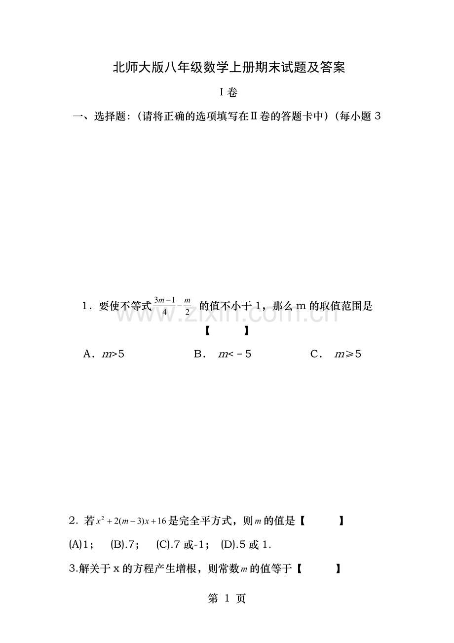 1.要使不等式 的值不小于1,那么m的取值范围是 【 】