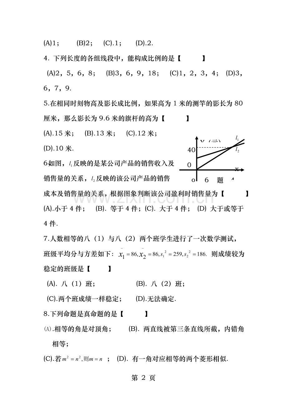 7.人数相等的八(1)与八(2)两个班学生进行了一次数学测试,班级平均分与方差如下: 则成绩较为稳定的班级是【 】