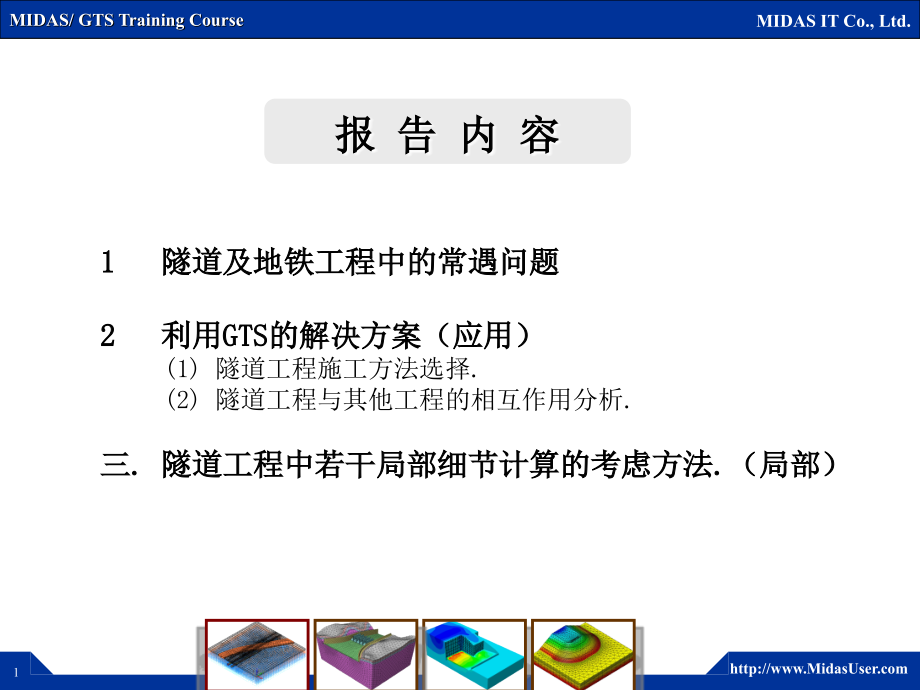 ,MIDAS/GTS Training Course,MIDAS IT Co.,Ltd.,www.MidasU,#,www.MidasU,报 告 内 容,隧道及地铁工程中的常遇问题,利用,GTS,的解决方案(应用),(1),隧道工程施工方法选择,.,(2),隧道工程与其他工程的相互作用分析,.,三,.,隧道工程中若干局部细节计算的考虑方法,.,(局部),一、,隧道及地铁工程中的常遇问题,www.MidasU,1,施工工况的优化和选择(针对隧道本身),工程经验不足 隧道洞口偏压 双,/,三联拱隧道 大断面,浅埋暗挖隧道 小净距隧道(主)考虑掘进长度的三维分析等,(结合苏州凤凰山双联拱隧道工程),2,隧道及地下工程开挖对已有建筑设施的影响,(结合深圳地铁,5,号线某桩基托换工程),3,新建地下工程对已建地下工程的影响评价,(结合广佛地铁二、八线沙园地铁车站及曲线盾构隧道相邻 建筑深基坑开挖工程),二、利用,GTS,的解决方案(应用),1,施工工况的优化和选择(针对隧道本身),(结合凤凰山双联拱隧道工程),苏州凤凰山隧道工程,位于苏州市吴中区木渎镇境内,属宝带西路延伸段改建工程的一部分,穿越七子山西北侧凤凰公墓区,隧址区为一小山体。苏州凤凰山隧道工程分一期和二期工程进行建设。凤凰山隧道一期工程为一座连拱隧道。,凤凰山隧道一期工程连拱隧道全长,175m,,起讫桩号分别为,K1+985,和,K2+160,其中明暗洞分界桩号为,K2+001,及,K2+144,,暗洞段长,143m,,属短隧道。,隧道最大埋深,23m,,埋深小于,10m,的暗洞长度占整个暗洞的比例约为,34,,属典型浅埋隧道。,根据地质报告,隧址区地质条件较差,,基本为,级围岩,隧道最大开挖跨度,32.2m,,属软弱围岩大跨隧道,。因此,,凤凰山连拱隧道属软弱围岩中浅埋大跨隧道,,施工具有较大难度。,(,1,)基于,荷载,-,结构法,的隧道结构静力计算分析,图,1-1,二次衬砌的侧向变形图,图,1-2,二次衬砌的竖向变形图,图,1-3,二次衬砌轴力图,图,1-4,二次衬砌弯矩图,(,2,)基于,地层,-,结构法,的隧道结构静力计算分析,凤凰山连拱隧道毛洞跨度达到,32.2m,,,且存在一定的偏压现象,,以前类似的工程较少,,可以借鉴的经验不多,,给设计带来了较大的困难,因此应对其进行相关计算,对设计进行校核。,图,2-1,联拱隧道整体模型,图,2-2,联拱隧道局部模型,图,2-3,中导洞开挖后的地层竖向位移图,图,2-4,左洞开挖后的地层竖向位移图,图,2-5,右洞开挖后的地层竖向位移图,图,2-8,中隔墙最大压应力图,图,2-6,围岩塑性拉应力区图,图,2-9,中隔墙最大拉应力图,图,2-7,围岩塑性压应力区图,图,2-10,导洞法开挖临时支护和初支部分内力图,图,2-12,二次支护组合应力图,图,2-11,二次支护结构轴力与弯矩图,小结:,在地下工程缺乏相应工程经验或者需要进行方案选择的时候,利用数值计算软件,可以对工程有初步和定性的认识,为工程设计提供重要参考。,2,隧道及地下工程开挖对已有建筑设施的影响,(结合深圳地铁,5,号线某桩基托换工程),说明:,1,,该工程为国内铁道第三设计院与韩国某工程咨询合作,利用,GTS,所做的一个深圳地铁,5,号线的桩基托换工程。,2,,计算主要考虑两点:,(,1,)由于盾构隧道穿过桩基础,因此需要对原桩基础进行托换,考察托换后对原有上部结构的影响。,(,2,)在托换以后地铁盾构将穿越桩基,计算模拟地铁掘进穿越桩基整个过程中,桩基所受到的侧向土压力的影响以及由此造成的上部结构的反应。,3,新建地下工程对已建地下工程的影响评价,(结合广佛地铁二、八线沙园地铁车站及曲线盾构隧道相邻建筑深 基坑开挖工程),本工程地块位于广州市海珠区工业大道北十一橡胶厂内。地下室形状为一不规则多边形,东侧是工业大道,其规划道路红线为,40,米;场地东南侧临近已完成主体结构施工的,沙园地铁站,,东北侧临近,广佛线地铁隧道,。南侧是榕景路,其规划道路红线为,26,米;西侧与,26,米规划路相接;北侧与规划路相接。,该工程基坑部分及地铁风亭部分由,广州市建筑科学研究院,设计,期间考虑到对地铁的保护,需要对基坑开挖对地铁及附属结构所造成的影响做出整体评价,因此对该工程进行了整体数值计算,并结合大量工程实际经验作出合理设计。,工程现状,:目前地铁车站已经施工完成,由于盾构隧道的工期与基坑工期先后不能确定,因此计算一并考虑了盾构隧道。,工程总体平面图,工期,工程所有结构位置关系图,新建基坑与地铁盾构隧道、地铁车站的数值计算部分,整体模型网格,计算目的:,由于基坑在车站及盾构隧道左侧开挖造成重大卸载,因此需要由此对地铁设施所造成的影响:,(,1,)地铁车站与盾构隧道连接处与基坑挖通,卸载最大,应充分考虑车站右侧土压力对现有车站结构的不利影响,a,(,2,)曲线盾构隧道段沿基坑东南侧整体卸载,土体回弹将使盾构隧道向基坑侧移动,需要对其影响进行整体评价。,(,3,)考虑到盾构井距离基坑很近,因此需要考虑对盾构井的影响,图,3-1,整体,X,方向位移图,图,3-2,整体,Y,向位移图,图,3-3,整体,Z,向位移图,图,3-4,结构单元内力图,计 算 结 果,车站右侧水平位移,车站左侧水平位移,结论,1,:,通过整体数值计算分析,地铁车站在一侧重大卸载的情况下,开挖近侧发生向基坑侧的位移,即车站与隧道连接处整体向基坑侧移动,车站尾部(远离基坑侧向远离基坑移动),根据经验和以往学术论文,在此位移下基坑开挖对车站影响较小。,结论,2,:,由于曲线盾构隧道沿着基坑布置,因此基坑开挖对隧道影响较大,且隧道衬砌(板单元)表面应力较大,内力也较大,考虑到安全