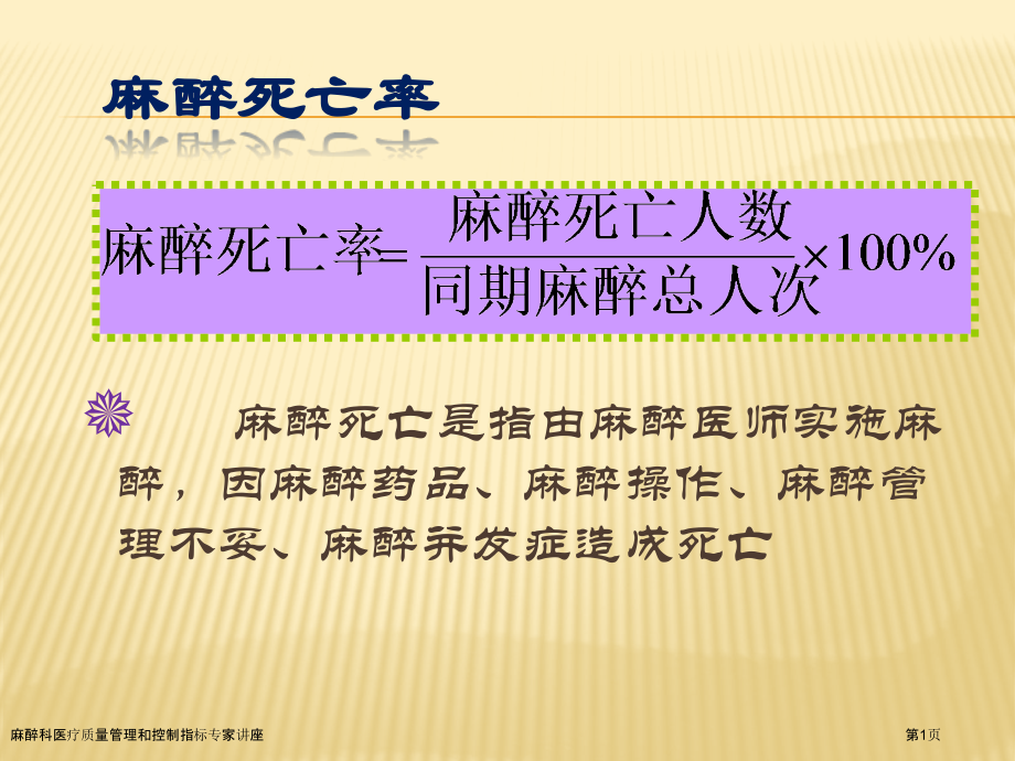 ,单击此处编辑母版文本样式,第二级,第三级,第四级,第五级,2012/6/15,#,单击此处编辑母版标题样式,麻醉死亡率,麻醉死亡是指由麻醉医师实施麻醉,因麻醉药品、麻醉操作、麻醉管理不妥、麻醉并发症造成死亡,麻醉科医疗质量管理和控制指标专家讲座,第1页,术中死亡率,术中死亡是指全部在手术中发生死亡,麻醉科医疗质量管理和控制指标专家讲座,第2页,困难气管插管比率,困难气管插管是指麻醉正规培训过麻醉医师三次气管插管未成功者,麻醉科医疗质量管理和控制指标专家讲座,第3页,麻醉后停手术发生率,麻醉后停手术是指已完成麻醉,但因各种原因而没有进行手术或操作,麻醉科医疗质量管理和控制指标专家讲座,第4页,术中严重低血压发生率,严重低血压是指非预期收缩压低于,70mmHg,或基础值,40,,并不易纠正连续超出,30 min,麻醉科医疗质量管理和控制指标专家讲座,第5页,术中严重心律失常发生率,严重心律失常是指非预期严重心律失常,影响血流动力学,屡次用药并不易纠正,连续存在超出,30 min,或屡次重复发作,麻醉科医疗质量管理和控制指标专家讲座,第6页,非预期改全麻比率术中非预期心跳骤停发生率,麻醉科医疗质量管理和控制指标专家讲座,第7页,术中非预期心跳骤停发生率,麻醉科医疗质量管理和控制指标专家讲座,第8页,术中严重低氧血症发生率,严重低氧血症是指麻醉前正常但术中吸氧状态下,SpO,2,低于,90,或,PaO,2,低于,70mmHg,,并不易纠正,连续超出,30 min,麻醉科医疗质量管理和控制指标专家讲座,第9页,术中严重凝血功效障碍发生率,术中严重凝血功效障碍是指术前正常,但术中发生严重凝血功效障碍,术野弥漫渗血,止血困难,或出现皮下出血,麻醉科医疗质量管理和控制指标专家讲座,第10页,术中血液回收比率,术中输血总人数包含自体输血和异体输血人数,麻醉科医疗质量管理和控制指标专家讲座,第11页,非预期麻醉气管拔管后再插管比率,非预期气管拔管后再插管是指由麻醉医师完成操作,麻醉科医疗质量管理和控制指标专家讲座,第12页,全麻后清醒延迟发生率,全麻后清醒延迟是指麻醉前清醒患者全麻后,2,小时内没有清醒者,麻醉科医疗质量管理和控制指标专家讲座,第13页,术后低体温发生率,术后低体温是指术后体温低于,36,,连续,1,小时以上,麻醉科医疗质量管理和控制指标专家讲座,第14页,严重麻醉并发症发生率,严重麻醉并发症是指由麻醉医师实施麻醉,因麻醉药品、麻醉操作、麻醉管理引发严重并发症,包含麻醉死亡、麻醉药过敏性休克、气道损伤出现皮下(纵隔)气肿或气管食道瘘、严重误吸、外周或中枢神经损伤功效障碍超出,1,个月、全麻清醒延迟、椎管内血肿或感染、非预期硬脊膜穿破、腰麻后低颅内压性头痛等,麻醉科医疗质量管理和控制指标专家讲座,第15页,危重患者麻醉比率,附录:,ASA,患者术前状态分级标准:,级:正常健康。,级:有轻度系统疾病。,级:有较严重系统性疾病,日常活动受限,但未完全丧失工作能力,生活能够自理。,级:有严重系统性疾病,已丧失工作能力,且面临生命威胁,生活不能自理。,级:不论手术是否,生命难以维持,24,小时濒死患者,麻醉科医疗质量管理和控制指标专家讲座,第16页,谢 谢,!,麻醉科医疗质量管理和控制指标专家讲座,第17页,