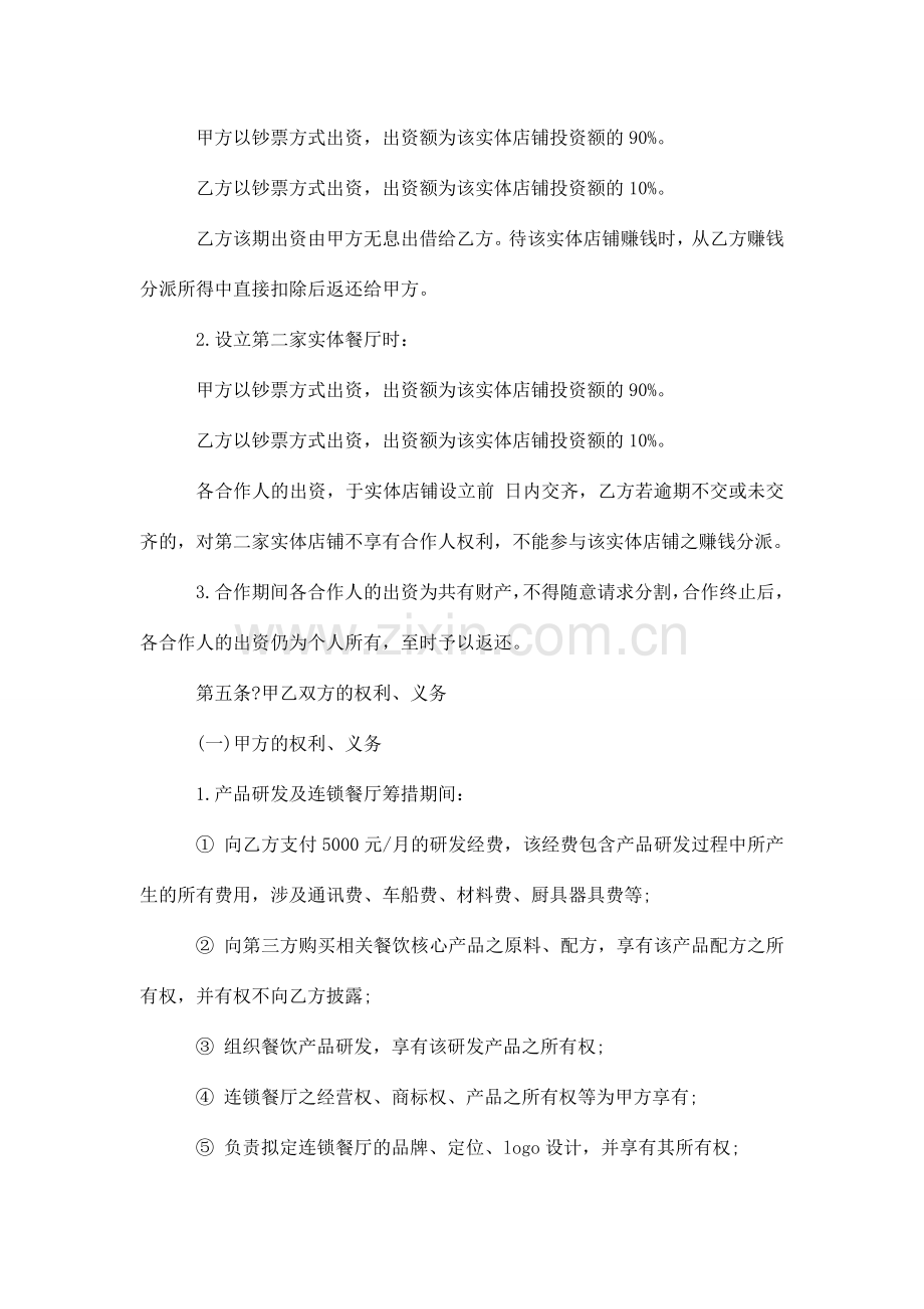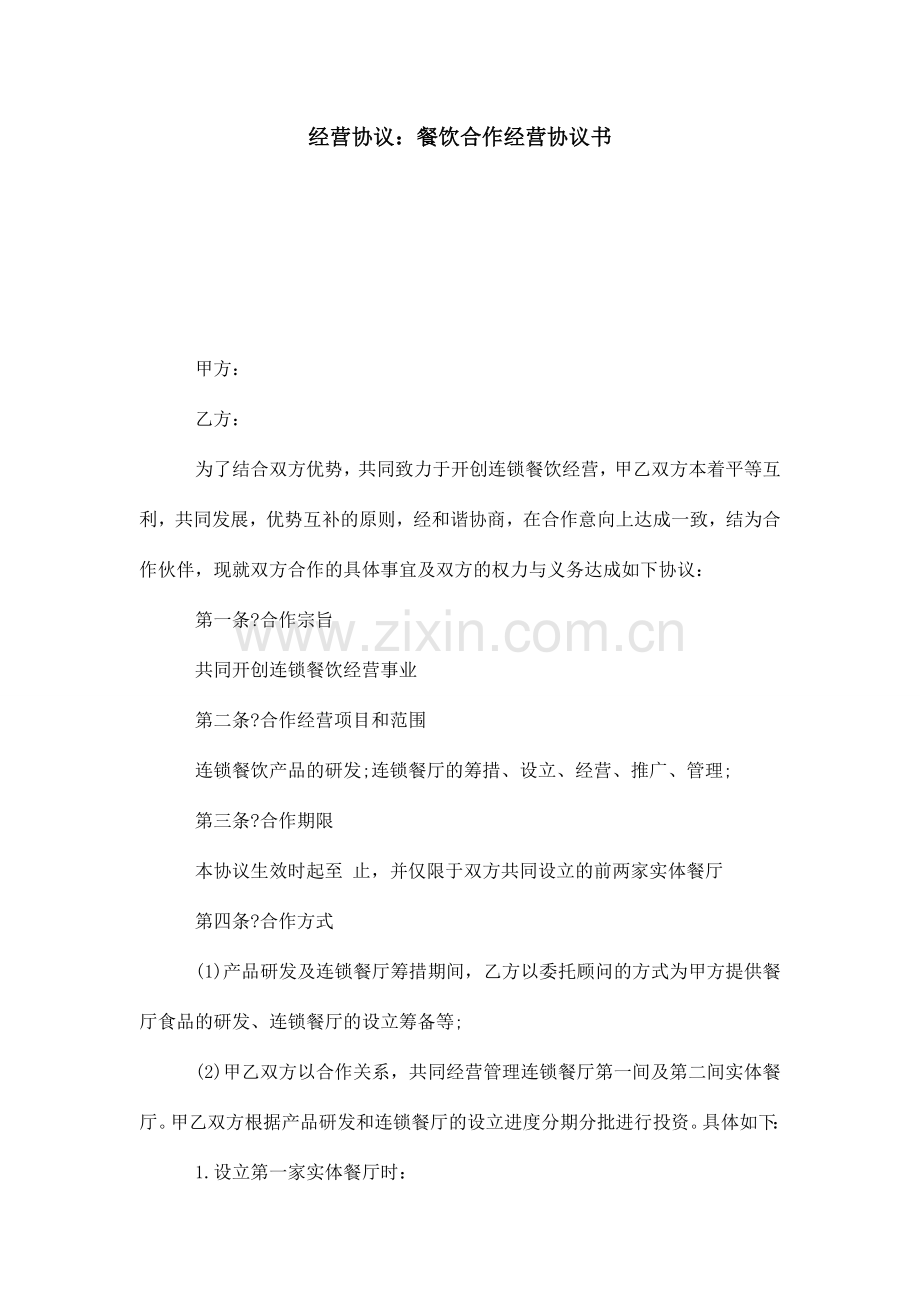 为了结合双方优势,共同致力于开创连锁餐饮经营,甲乙双方本着平等互利,共同发展,优势互补的原则,经和谐协商,在合作意向上达成一致,结为合作伙伴,现就双方合作的具体事宜及双方的权力与义务达成如下协议: