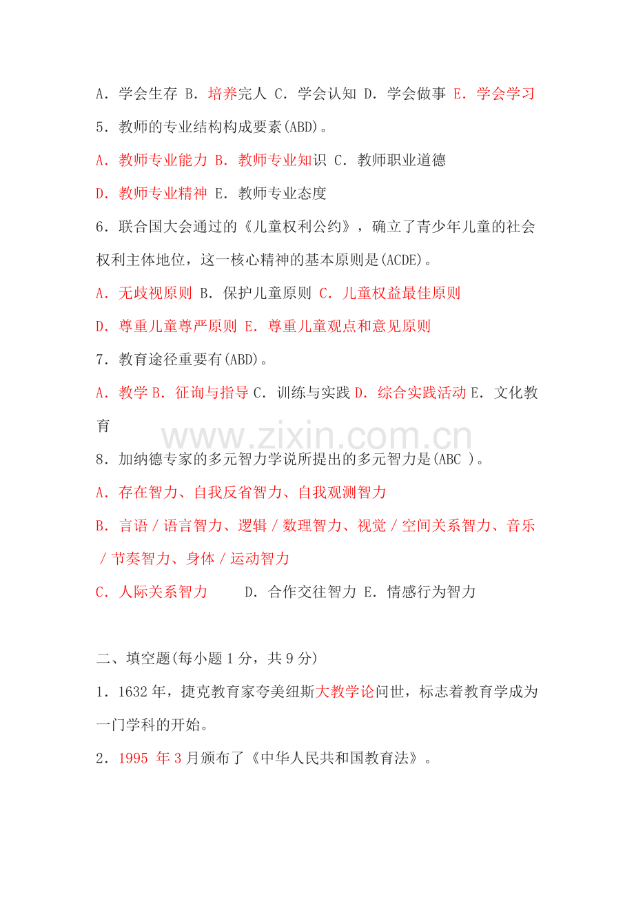 1.1995 2.教育性 3.爱弥儿 4.学会关心 5.遗 传因素(素质) 6.国际视野 积极生存 7.增强学生社会责任感 8.自主性 发明性 9.学校教育的局限性 10.思想观念