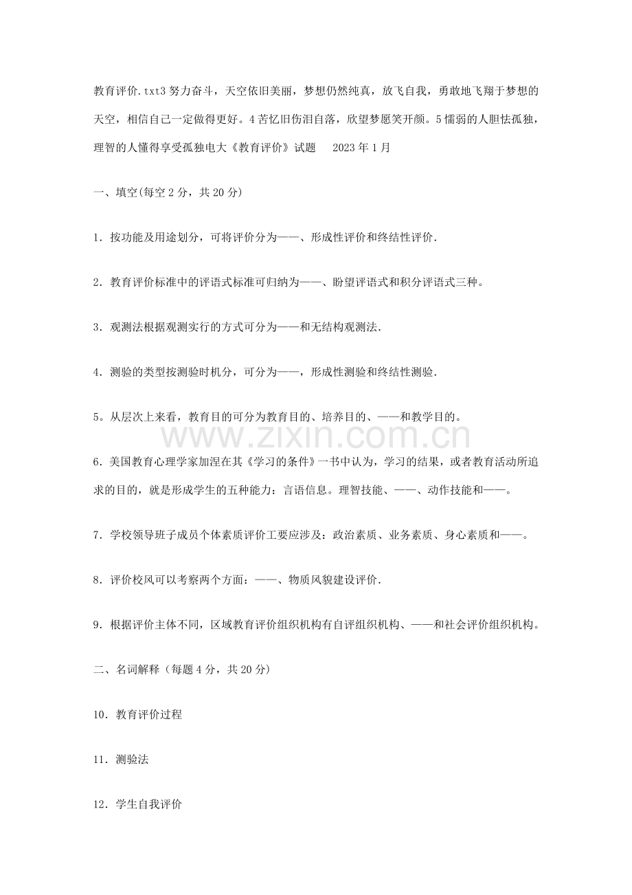 教育评价.txt3努力奋斗,天空依旧美丽,梦想仍然纯真,放飞自我,勇敢地飞翔于梦想的天空,相信自己一定做得更好。4苦忆旧伤泪自落,欣望梦愿笑开颜。5懦弱的人胆怯孤独,理智的人懂得享受孤独电大《教育评价》试题 2023年1月