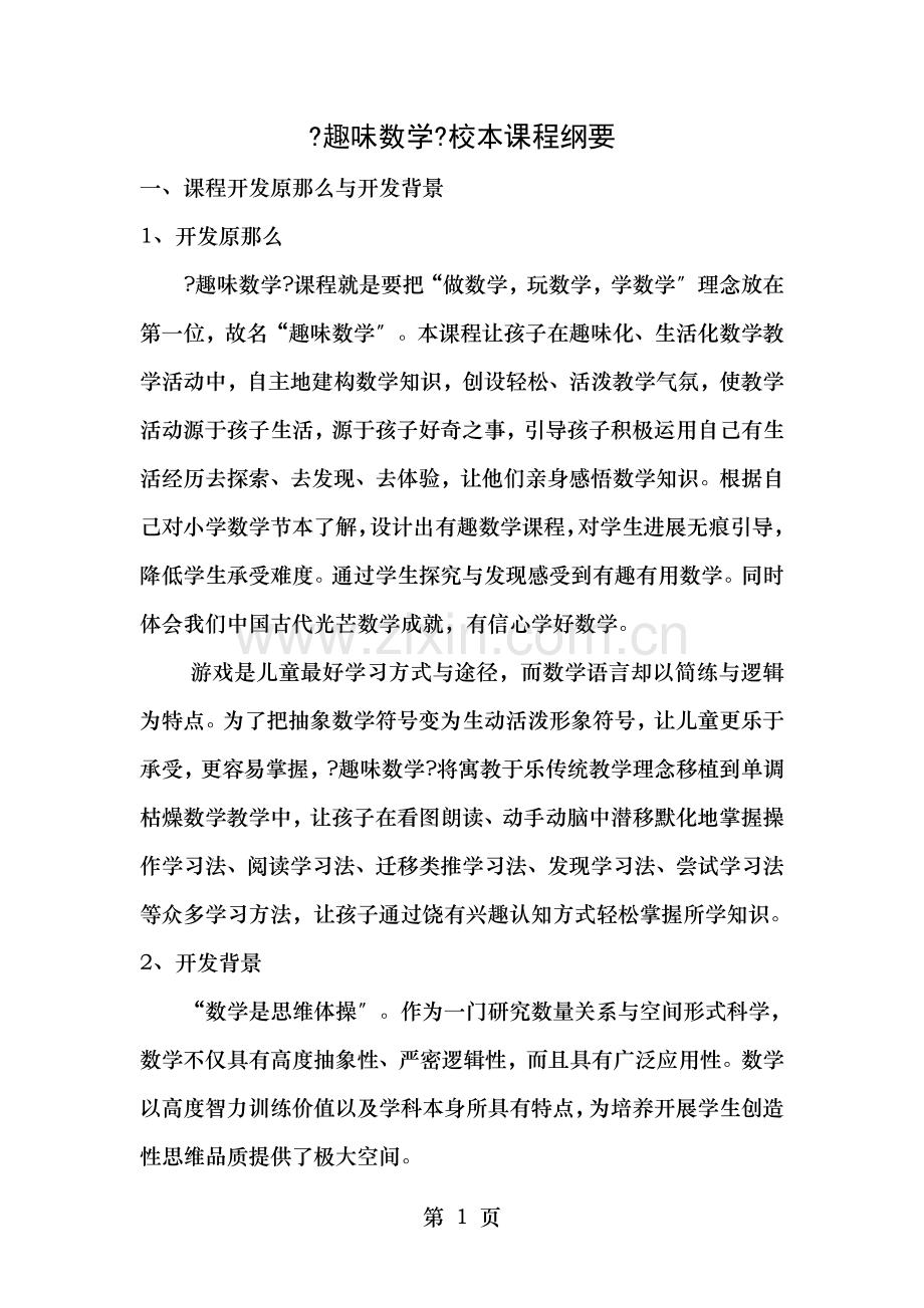 ?趣味数学?课程就是要把“做数学,玩数学,学数学〞理念放在第一位,故名“趣味数学〞。本课程让孩子在趣味化、生活化数学教学活动中,自主地建构数学知识,创设轻松、活泼教学气氛,使教学活动源于孩子生活,源于孩子好奇之事,引导孩子积极运用自己有生活经历去探索、去发现、去体验,让他们亲身感悟数学知识。根据自己对小学数学节本了解,设计出有趣数学课程,对学生进展无痕引导,降低学生承受难度。通过学生探究与发现感受到有趣有用数学。同时体会我们中国古代光芒数学成就,有信心学好数学。
