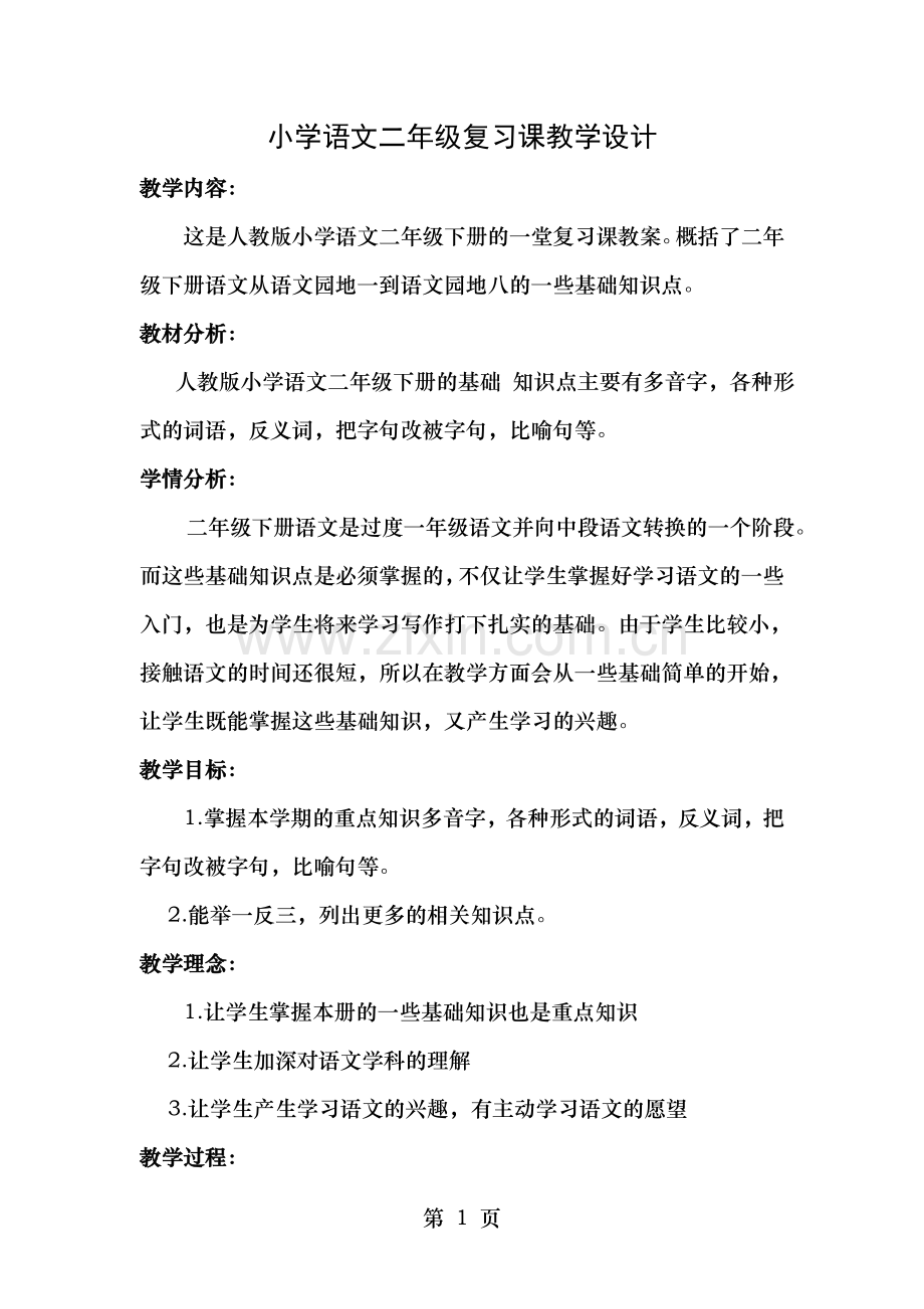 这是人教版小学语文二年级下册的一堂复习课教案。概括了二年级下册语文从语文园地一到语文园地八的一些基础知识点。
