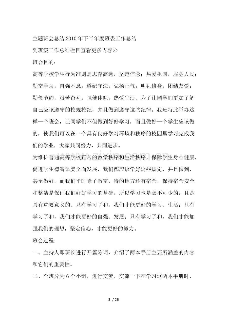 “学生手册、学生公寓管理手册学习交流会”班会总结2010年下学期班级工作总结班级评选助学金工作总结下学期班级工作总结预防青少年犯罪主题班会总结运动会班委工作总结报告“诚信学习,诚信考试”主题班会总结2010年下半年度班委工作总结