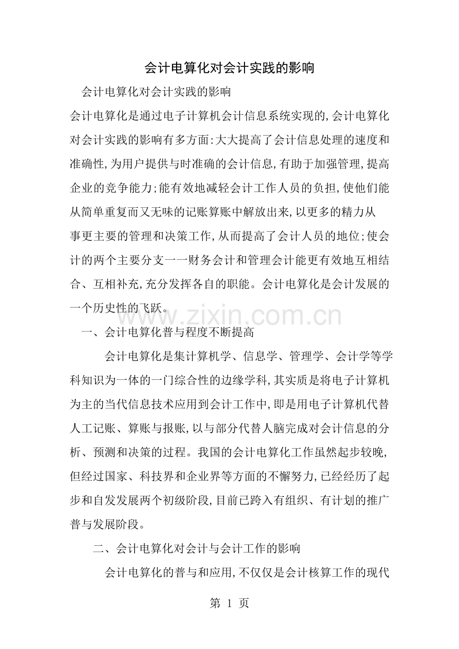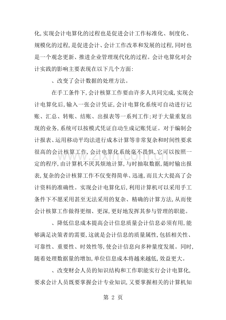 会计电算化是通过电子计算机会计信息系统实现的,会计电算化对会计实践的影响有多方面:大大提高了会计信息处理的速度和准确性,为用户提供与时准确的会计信息,有助于加强管理,提高企业的竞争能力;能有效地减轻会计工作人员的负担,使他们能从简单重复而又无味的记账算账中解放出来,以更多的精力从