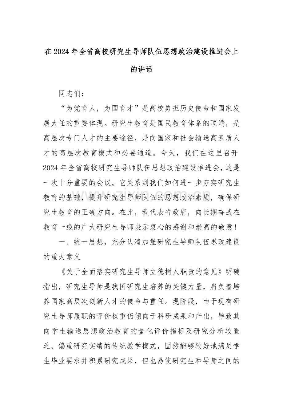 在2024年全省高校研究生导师队伍思想政治建设推进会上的讲话