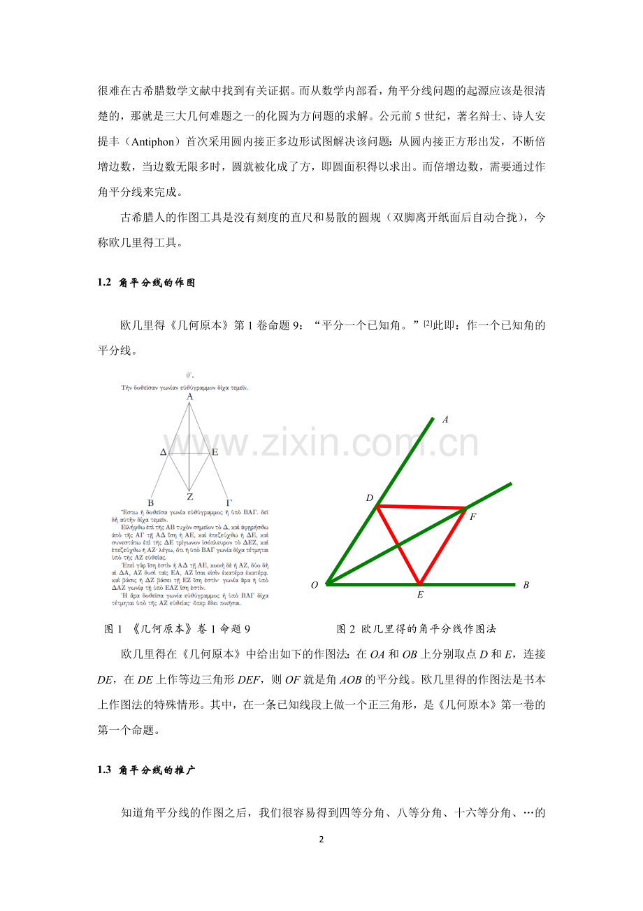 角平分线问题或许源于生活实际,但古希腊数学家并不重视数学的实际应用,因而我们很难在古希腊数学文献中找到有关证据。而从数学内部看,角平分线问题的起源应该是很清楚的,那就是三大几何难题之一的化圆为方问题的求解。公元前5世纪,著名辩士、诗人安提丰(Antiphon)首次采用圆内接正多边形试图解决该问题:从圆内接正方形出发,不断倍增边数,当边数无限多时,圆就被化成了方,即圆面积得以求出。而倍增边数,需要通过作角平分线来完成。