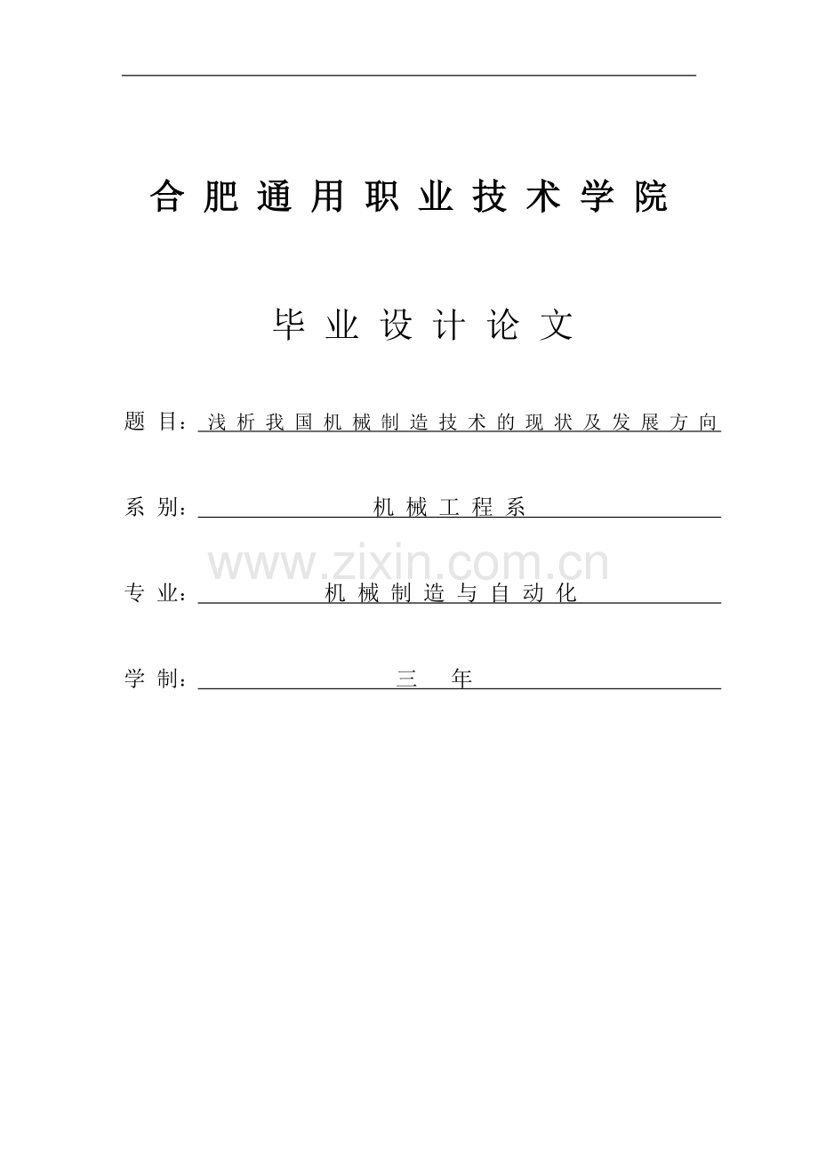 题 目: 浅 析 我 国 机 械 制 造 技 术 的 现 状 及 发 展 方 向