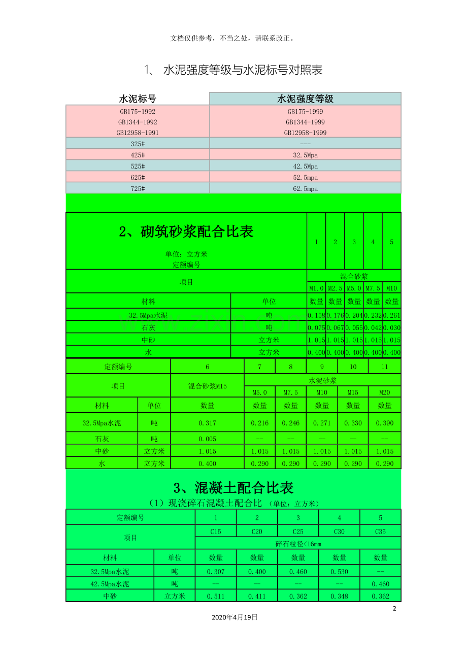1、 水泥强度等级与水泥标号对照表