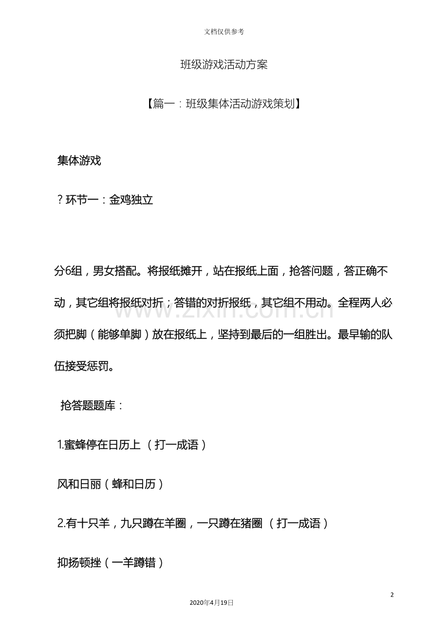 两人搭档,用肢体语言表演一个成语,在5分钟计时内猜出最多的队伍获胜。能够有一次pass的机会。猜出最少的队接受惩罚。共组3---4队。