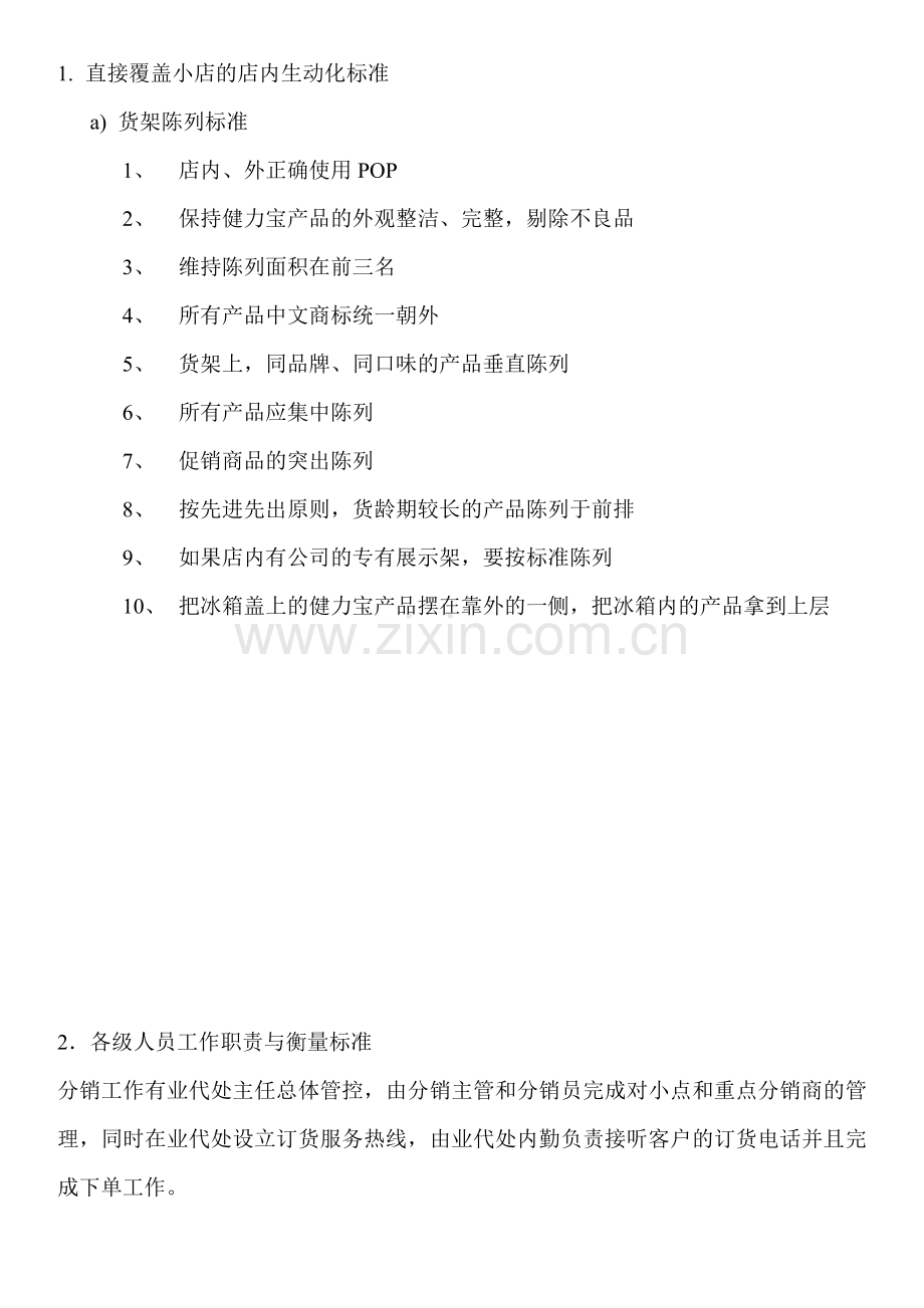 l 对重点小店做重复的拜访,卖入健力宝产品,接受订单,处理订单(交由重点分销商送货)