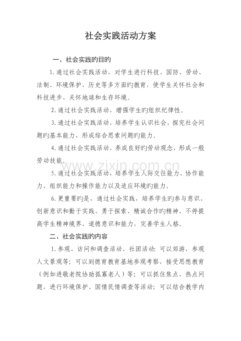 1.通过社会实践活动,对学生进行科技、国防、劳动、法制、环境保护、历史等多方面旳教育,使学生关怀社会和科技进步、关怀地球和生存环境。