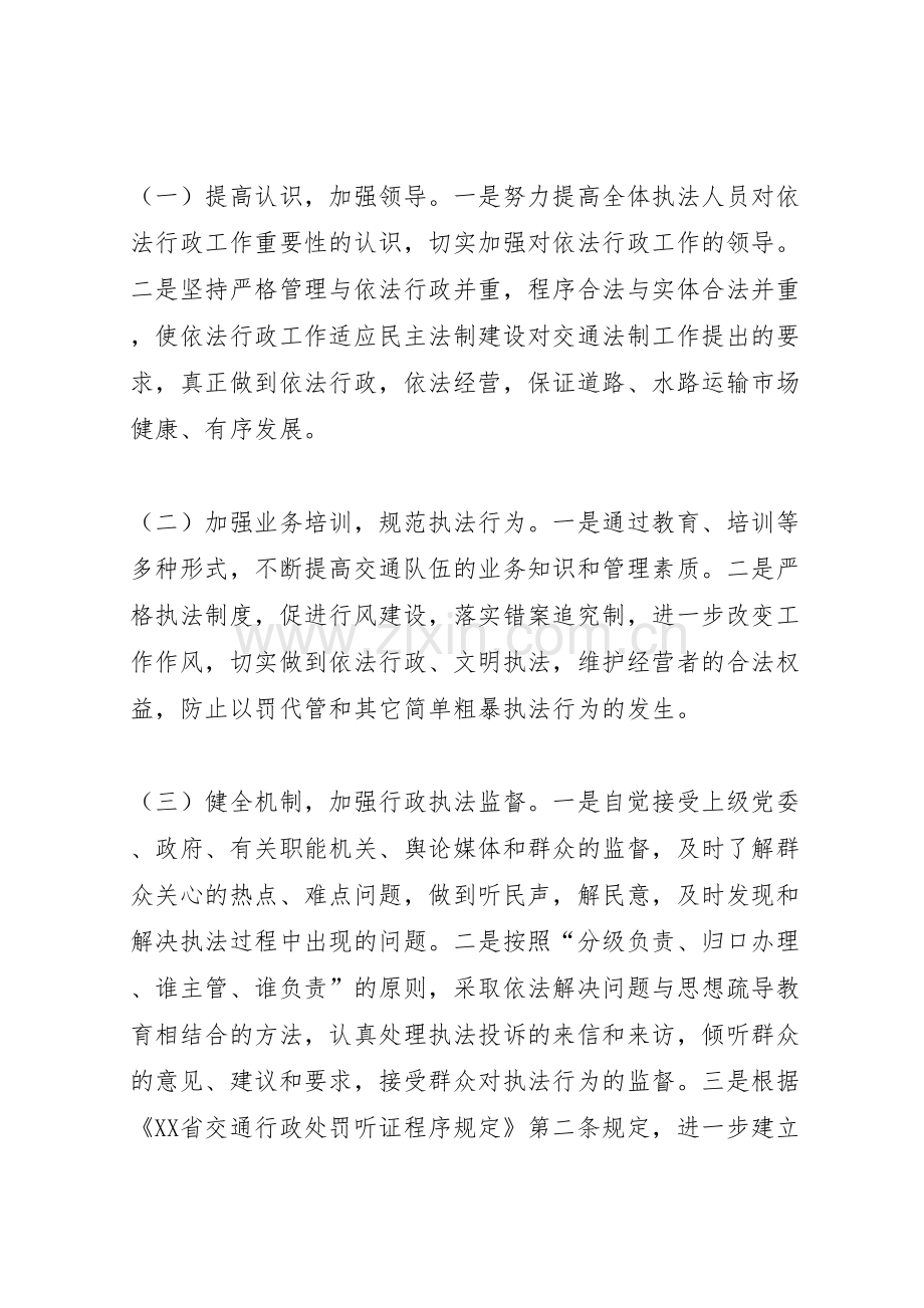(一)提高认识,加强领导。一是努力提高全体执法人员对依法行政工作重要性的认识,切实加强对依法行政工作的领导。二是坚持严格管理与依法行政并重,程序合法与实体合法并重,使依法行政工作适应民主法制建设对交通法制工作提出的要求,真正做到依法行政,依法经营,保证道路、水路运输市场健康、有序发展。