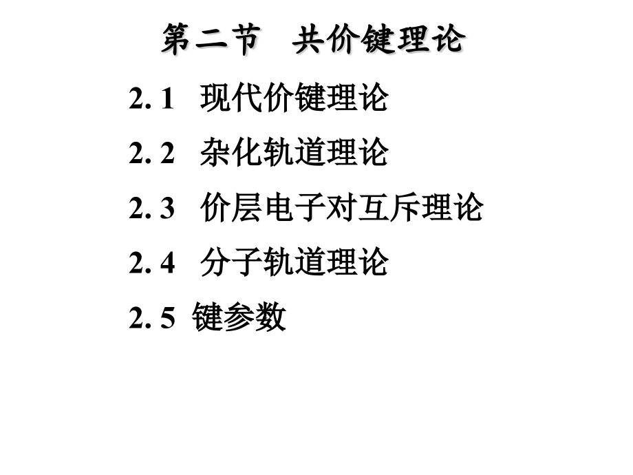 单击此处编辑母版标题样式,单击此处编辑母版文本样式,第二级,第三级,第四级,第五级,#,第二节 共价键理论,2.1,现代价键理论,2.2,杂化轨道理论,2.3,价层电子对互斥理论,2.4,分子轨道理论,2.5,键参数,电子配对后,为什么不互相排斥?,路易斯(经典)共价键理论不能解释:,共价键的方向性和饱和性,许多化合物中,中心原子最外层电子数,8,如:,PCl,5,、,SF,6,、,IF,7,;有的,8,,如:,BF,3,离子键理论(,IBT,)虽能很好地说明离子化合物的形成和特征,但对大部分化合物比如,O,2,、,N,2,、,F,2,等,,H,2,O,、,HF,、,CH,4,、,NH,3,等难以作出合理的说明,.,1916,年,美国化学家路易斯,(Lewis),提出了经典的共价键理论,八,隅,律,,分子中原子间靠共用电子对形成稳定的,8,电子结构,1927,年,,Heitler,和,London,用量子力学处理,H,2,,才使共价键的本质获得初步解答。,1930,年,著名的美国化学家,Pauling,建立了现代价键理论,1931,年又提出了杂化轨道理论、价层电子对互斥理论。,1932,年,美国的另一个化学家,Meilgen,和德国化学家,Hund,提出分子轨道理论。,2.1,现代价键理论(,VBT,)电子配对法,E,0,D,R,r,o,从图中可以看出,,r=r,0,时,,E,值最小,,表明此时两个,H,原子之间形成了化学键。,H,2,分子中的化学键,结论:形成,H,2,关键在于电子自旋方向相反,。,基态分子,排斥态分子,现代价键理论,一、共价键的本质,基态氢分子,核间电子概率密度,大,形成负电区,两核吸引核间负电区,,形成共价键。,排斥态氢分子,核间电子概率密度几乎为零,,,不能成键。,在电子云分布上的差别:,现代价键理论,共价键的本质,:,由于原子相互接近时原子轨道重叠(即波函数叠加),自旋相反的电子配对,在两原子间共用,使能量降低而成键。,1.,电子配对原理,共价单键、,2.,能量最低原理,3.,原子轨道(,AO,),最大重叠原理,AO,最大重叠有两个条件:,AO,对称性匹配,AO,重叠方向要适当,二、成键的原理,自旋相反,配对放出能量,共价双键、共价三键,现代价键理论,AO,对称性匹配,AO,重叠方向要适当,两个,的正或负必须相同(“,+”,与“,+”,,“,-”,与“,-”,),电子云密度才增加,体系能量才降低,分子才能稳定。,只有按一定的重叠方向,,AO,方能达到最大程度的重叠。,现代价键理论,三、共价键的特点,共价键的结合力,本质是电性吸引力,共价键的饱和性,一个原子有几个未成对的电子,,便与几个自旋相反的成单电子配对成键,.,如:,H,H,2,(,),(),原子轨道重叠多少共用电子对的数目和重叠方式,现代价键理论,共价键的方向性,各原子轨道在空间分布方向是固定的,为了满足轨道的最大程度重叠,原子间形成的共价键,当然有方向性。,共价键的方向性决定了分子的空间构型,进而影响分子的性质。,以,HCl,为例:,+,+,+,1s,z,+,3p,z,z,现代价键理论,四、共价键的键型,按,原子轨道,的重叠方式不同可分为:,1.,键:,键、,键、,配位,键,两个原子轨道沿键轴(,核间联线),方向,以“头碰头”方式发生轨道最大重叠。,成键轨道重叠部分围绕键轴呈圆柱形对称分布。,原子轨道重叠的程度非常大,所以,键很牢固。,现代价键理论,2.,键:,成键,AO,沿垂直于键轴的方向,,以“肩并肩”方式重叠。,现代价键理论,键不会单独存在,它总是和,键相伴形成。,键不如,键键能大。,例如:讨论氮气分子中化学键的类型,N,2,分子的,3,个键,即,1,个 键,(p,x,-p,x,),,,2,个 键,(p,z,-p,z,,,p,y,-p,y,),。,现代价键理论,两个原子靠,2,个,e,-,形成的,键,,称之为,小,键,,又称之为,正常,键,;,两个原子靠,1,个,e,-,形成的,键,两个原子靠,3,个,e,-,形成的,键,3,个或,3,个以上原子形成的,键,称之,单电子,键,称之为,3e,-,小,键,称之为大,键,又叫离域大,键,现代价键理论,形成条件,:,成键原子一方提供孤对电子,另一方提供空轨道。,3.,配位键(共价键,里的一种特殊形式),现代价键理论,所以,CO,的结构式可写为:,CO,中含有一个,键,一个,键,一个配位键。,现代价键理论,现代价键理论的先进性:,阐明了共价键的形成过程和本质,成功的解释了共价键的方向性和,饱和性,局限性,难以解释一些化合物分子的空间,构型。,无法解释,CH,4,的结构,为什么,H,2,O,的键角是,10418,,而不是,90,?,现代价键理论,1,、成键时能级相近的价电子轨道相混杂,形成新的价电子轨道,杂化轨道,一,.,基本要点,3,、杂化后轨道伸展方向,形状和能量发生改变,2,、杂化前后轨道数目不变,2.2,杂化轨道理论,(,HOT,),在形成分子时,由于原子的相互影响,若干不同类型能量相近的原子轨道混合起来,重新组合成一组新轨道,这种轨道重新组合的过程叫做杂化,所形成的新轨道称为杂化轨道。,如:一个,s,三个,p,轨道,可组合为四个,sp,3,杂化轨道,.,4,、,杂化轨道成键时要满足,AO,最大重叠原理即杂化轨道与其他,AO,进行重叠形成的键,往往是,键,.,5,、,杂化轨道与其他,AO,成键,要满足排斥作用最小原理,.,即杂化轨道与其他,AO,成键时有一定的方向和夹角,.,注意:原子轨道的杂化,只有在形成分子时才可能发生,孤立的原子是不可能杂化的。,杂化轨道理论,HOT,解释分子形成过程的步骤,“,四步曲”,基态、,激发态,、,杂化态、,成键态,.,激发,杂化,sp,3,杂化,杂化态,成键,4H,成键态,4,个(,sp,3,s,),键,2s,2,C,基态,2p,2,2s,1,激发态,2p,3,Be,:,2s,2,2p,0,1,、,sp,杂化,Be,采用,两个,sp,杂化,轨道与两个氢原子的,1s,轨道重叠,生成,BeH,2,二、杂化方式,sp,sp,杂化,2p,以,BeH,2,为例,杂化轨道理论,BeH,2,的空间构型为直线形,H,H,Be,杂化轨道理论,中心原子的 一个,ns,和