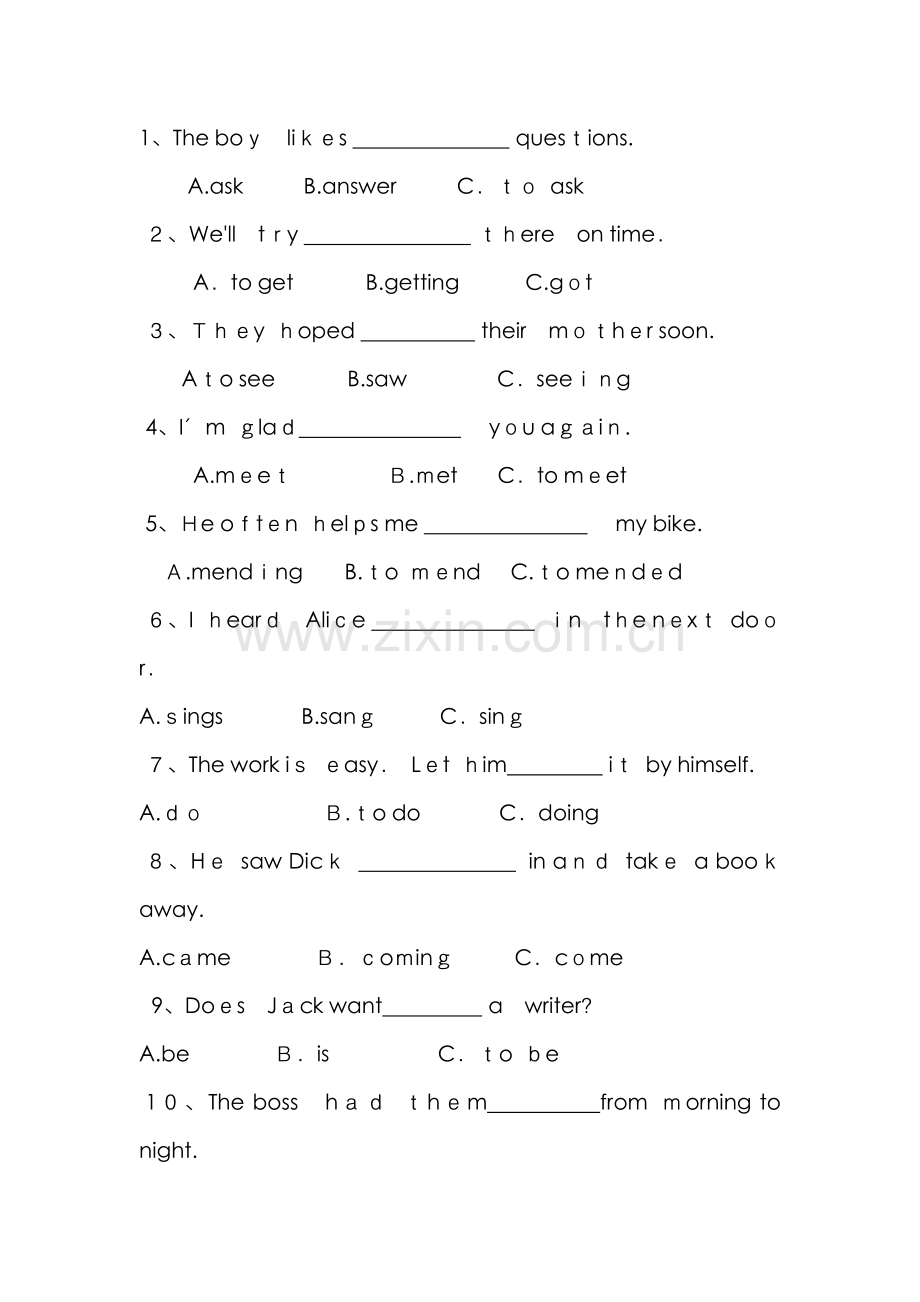A.to come B.will come C.coming