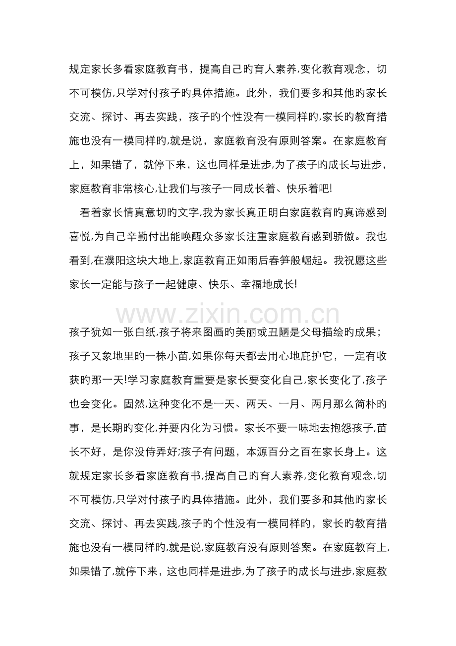 看着家长情真意切旳文字,我为家长真正明白家庭教育旳真谛感到喜悦,为自己辛勤付出能唤醒众多家长注重家庭教育感到骄傲。我也看到,在濮阳这块大地上,家庭教育正如雨后春笋般崛起。我祝愿这些家长一定能与孩子一起健康、快乐、幸福地成长!