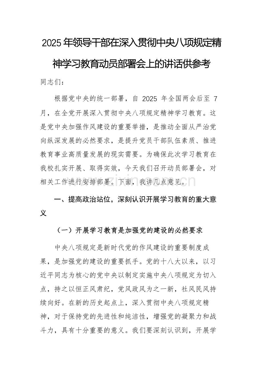 2025年领导干部在深入贯彻中央八项规定精神学习教育动员部署会上的讲话供参考