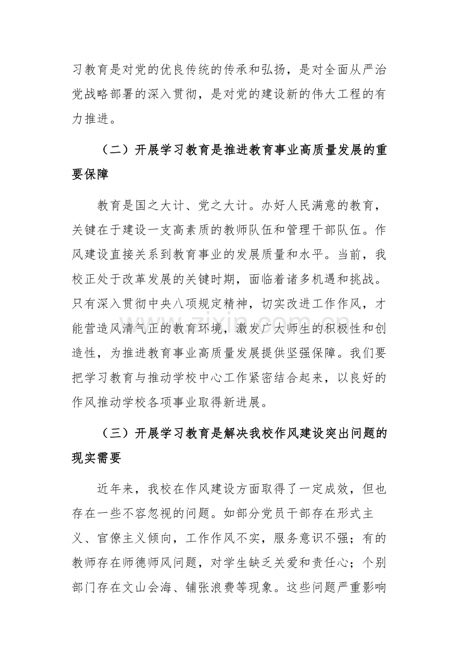 教育是国之大计、党之大计。办好人民满意的教育,关键在于建设一支高素质的教师队伍和管理干部队伍。作风建设直接关系到教育事业的发展质量和水平。当前,我校正处于改革发展的关键时期,面临着诸多机遇和挑战。只有深入贯彻中央八项规定精神,切实改进工作作风,才能营造风清气正的教育环境,激发广大师生的积极性和创造性,为推进教育事业高质量发展提供坚强保障。我们要把学习教育与推动学校中心工作紧密结合起来,以良好的作风推动学校各项事业取得新进展。