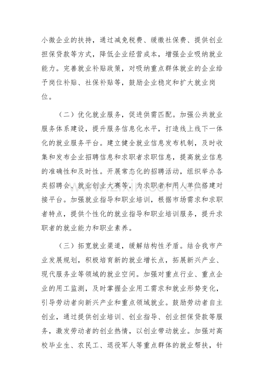 (三)拓宽就业渠道,缓解结构性矛盾。结合我市产业发展规划,积极培育新的就业增长点,拓展新兴产业、现代服务业等领域的就业空间。加强对重点行业、重点企业的用工监测,及时掌握企业用工需求和就业形势变化,引导劳动者向新兴产业和重点领域就业。鼓励劳动者自主创业,通过提供创业培训、创业指导、创业担保贷款等服务,激发劳动者的创业热情,以创业带动就业。加强对高校毕业生、农民工、退役军人等重点群体的就业帮扶,针对不同群体的特点和需求,制定个性化的就业帮扶措施,促进重点群体充分就业。