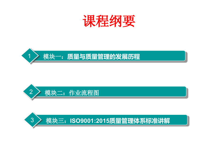 单击此处编辑母版标题样式,单击此处编辑母版文本样式,第二级,第三级,第四级,第五级,ISO9001:2015,培训教材,课程纲要,模块一:,质量与质量管理的发展历程,1,模块三:,ISO9001:2015,质量管理体系标准讲解,3,模块二:作业流程图,2,我们的约定,专心听讲(请手机“收声”),积极思维(杜绝“鱼眼”现象),互动学习(敞开心胸、积极投入,但须避免“小儿多动症”),休息时间(允许短时外出、保持安静),请勿在课室内吸烟,模块一、,质量与质量管理的发展历程,您对质量的理解是什么?,站的角度不同、对质量的理解与定义也不同(客户、生产方),符合性质量(克劳士比),适用性质量(朱兰),费根堡姆、朱兰、戴明、克劳斯比、石川馨等,聚焦于体系质量和经营质量,质量改进之父:,W.E.,戴明,(1900-1993),质量领域的首席建筑师:J.M.朱兰(1904-,2008,),TQC,之父:费根鲍姆,Armand V.Feigenbaum(1920-),零缺陷管理之父:,克劳士比,Philip B.,Crosby,(1926-2001),QCC之父:,石川馨,Kaoru Ishikawa,(1915-1989),什么是质量?,客体的若干固有特性满足要求的程度,何谓质量?,客体的若干固有特性满足要求的程度。,ISO9000:2015,质量管理体系-基础和术语,“,客体,”,是指可感知或想象的任何事物。如:,产品、服务、过程、人、组织、体系、资源等。,“,固有,”,是指某事或某物中本来就有的,尤其是那种永久。如:,LCD,具有显示功能;电视机可以看;手机可以打电话,“特性”,的载体,它不仅是产品和服务、也可以是某项活动或过程的工作质量,还可以是管理体系运行的质量或人以及上述各项的任何组合。如:,性能、寿命、可靠性、安全性、经济性、价格等,“要求”,是由组织利益相关方,如顾客、股东、雇员、供应商、工会、合作伙伴或社会团体等所提出的,明示的、隐含的和必须履行的要求和期望,。,何谓质量特性?,与要求有关的,客体的固有特性。,注 1:“固有的”是指本来就有的,尤其是那种永久的特性。,注 2:赋予客体的特性(如:客体的价格)不是它们的质量特性。,大,Q VA,小,q,题目,小,Q,大,Q,产品,制造的有形产品,所有类型的产品,无论是否销售,行业,制造业,所有行业:各企事业单位,质量被看成,技术问题,经营问题,顾客,购买产品的用户,所有受影响的人:内部与外部,如何认识质量,职能、部门的观点,基于具有普遍意义的,“,三部曲,”,质量目标包括在,工厂目标中,公司经营计划中,大,Q VA,小,q,题目,小,Q,大,Q,过程,直接与产品制造有关的过程,包括制造、支持服务和业务在内的所有过程,不良的质量成本,与不良的产品加工有关的成本,若每件事都能做得完美,将会消失的所有成本,改进针对,部门绩效,公司绩效,质量评价主要依据,符合工厂规范、程序、标准,反映顾客需要的符合程度,质量管理培训,集中在质量部门,全公司范围,协调者,质量经理,高层管理者组成的质量委员会,质量管理的概念,质量管理,:在质量方面发挥和控制组织的协调一致的活动。通常包括制定质量方针、质量目标、质量策划、质量控制、质量保证和质量改进。,质量策划:致力于制定质量目标并确定必要的运行过程和相关资源以实现质量目标;,质量控制:致力于满足质量要求,质量保证:致力于提供质量要求会得到满足的信任;,质量改进:致力于增强满足质量要求的能力,质量管理的发展历程,质量检验,统计质量控制,SQC,全面质量管理,TQM,质量管理的发展历程,三阶段比较,小故事:降落伞的真实故事,品质没有折扣,多站在消费者的观点想一想不知道那位大师曾经说过这样的话,“,品质没有折扣,”,,品质就是按照客户的要求执行!,这是一个发生在第二次世界大战中期,美国空军和降落伞制造商之间的真实故事。在当时,降落伞的安全度不够完美,即使经过厂商努力的改善,使得降落伞制造商生产的降落伞的良品率已经达到了,99.9%,,应该说这个良品率即使现在许多企业也很难达到。但是美国空军却对此公司说,No,他们要求所交降落伞的良品率必须达到,100%,。于是降落伞制造商的总经理便专程去飞行大队商讨此事,看是否能够降低这个水准?因为厂商认为,能够达到这个程度已接近完美了,没有什么必要再改。当然美国空军一口回绝,因为品质没有折扣。,后来,军方要求改变了检查品质的方法。那就是从厂商前一周交货的降落伞中,随机挑出一个,让厂商负责人装备上身后,亲自从飞行中的机身跳下。这个方法实施后,不良率立刻变成零。,讨论时间:,1,、你对质量的理解是什么?,2,、在公司内,你扮演什么质量角色?,模块二、作业流程图,模块三、,ISO9001,:20,15,质量管理体系标准讲解,非政府性的国际标准化组织,International,Organization for Standardization,(,ISO,),TC176,和,ISO9000,品质管理和品质保证技术委员会,总部设在瑞士日内瓦的,ISO,至今已有,60,多年历史,ISO 9000,标准沿革,MIL-Q-9858,AQQP,BS 5750,ISO 9000,质量系列标准,(,1987,年版),ISO 9000,质量系列标准,(,1994,年版),ISO 9000,质量系列标准,(,2000,年版),ISO 9000,质量系列标准,(2015,年版),(美国品保保证),(北约品保标准),(英国国家标准),(转化为各国国家标准),ISO 9000,质量系列标准,(,2008,年版),ISO9000,是一,“,族,”,标准,1987,年第一版,(,6,个),1994,年第二版(,16,个),2000,年第三版,(核心标准,4,个),2015,年发布新版的,ISO9001,ISO9000,:,201,5,质量管理体系-基础和术语,ISO9001,:,2015,质量管理体系-要求,ISO9004,:,200,9,追求组织的持续成功-质量管理方法,ISO19011,:,20,11,管理体系审核指南,2008,